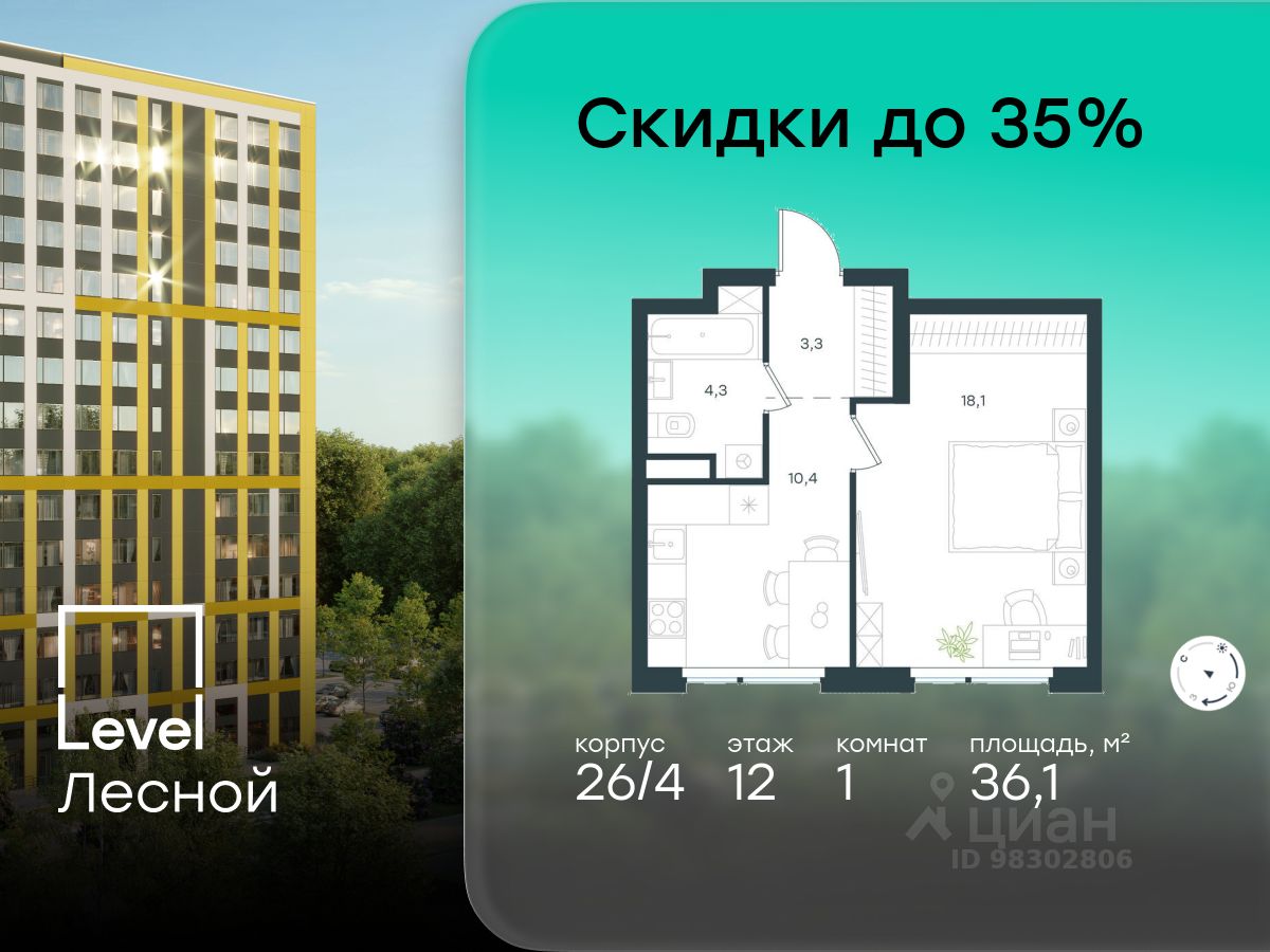 В районе, утопающем в густой зелени лесов, многочисленных парков и скверов, продаётся 1-комнатная квартира площадью 36.10 кв.м с отделкой white box. Квартира расположена на 12 этаже в жилом комплексе комфорт-класса Level Лесной (компания Level Group/Левел групп).