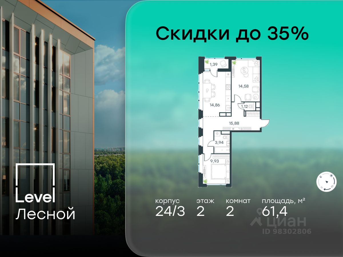 В районе, утопающем в густой зелени лесов, многочисленных парков и скверов, продаётся 2-комнатная квартира площадью 61.40 кв.м с отделкой white box. Квартира расположена на 2 этаже в жилом комплексе комфорт-класса Level Лесной (компания Level Group/Левел групп).