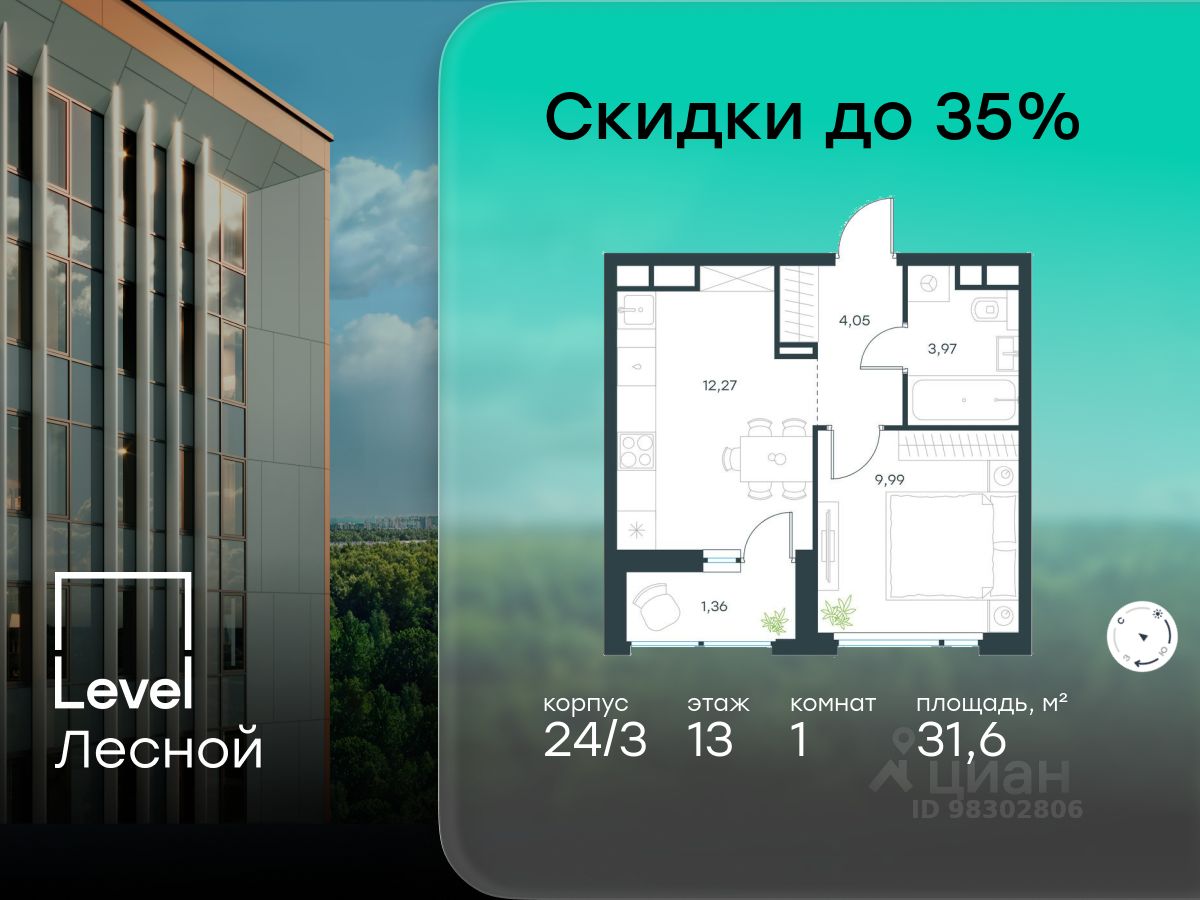 В районе, утопающем в густой зелени лесов, многочисленных парков и скверов, продаётся 1-комнатная квартира площадью 31.60 кв.м с отделкой white box. Квартира расположена на 13 этаже в жилом комплексе комфорт-класса Level Лесной (компания Level Group/Левел групп).