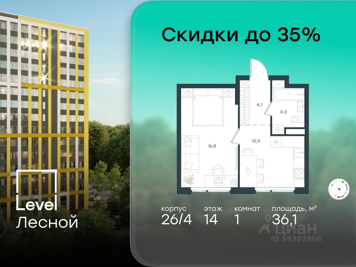 В районе, утопающем в густой зелени лесов, многочисленных парков и скверов, продаётся 1-комнатная квартира площадью 36.10 кв.м с отделкой white box. Квартира расположена на 14 этаже в жилом комплексе комфорт-класса Level Лесной (компания Level Group/Левел групп).