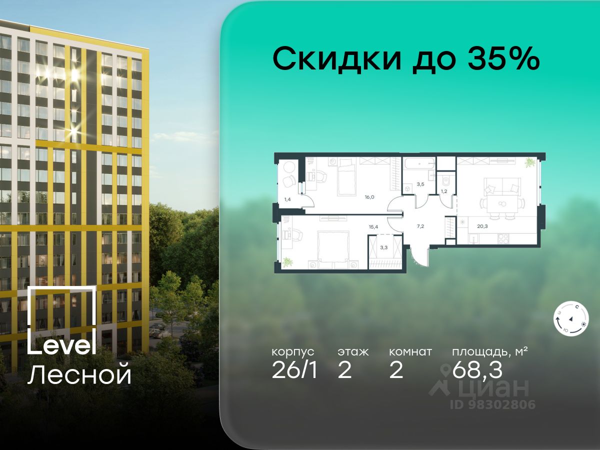 В районе, утопающем в густой зелени лесов, многочисленных парков и скверов, продаётся 2-комнатная квартира площадью 68.30 кв.м с отделкой white box. Квартира расположена на 2 этаже в жилом комплексе комфорт-класса Level Лесной (компания Level Group/Левел групп).