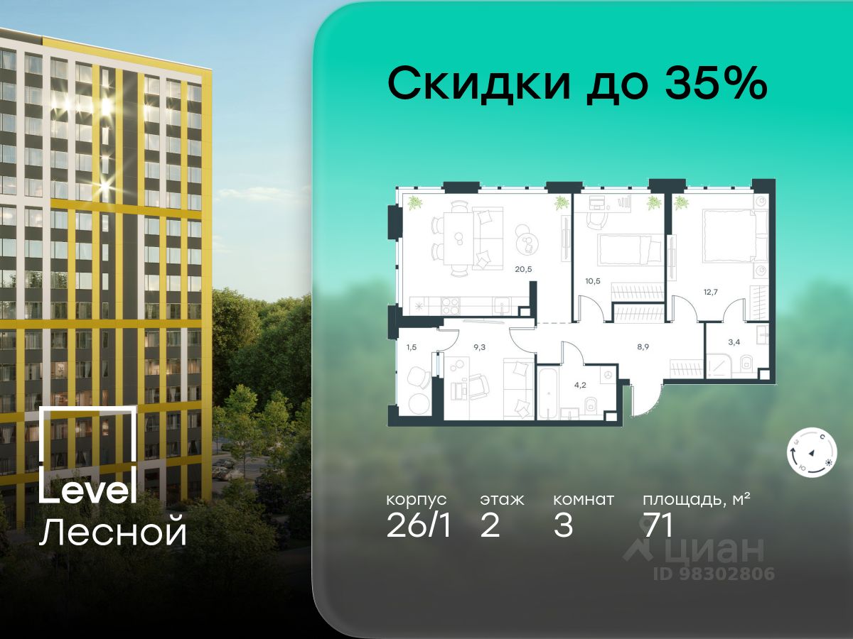 В районе, утопающем в густой зелени лесов, многочисленных парков и скверов, продаётся 3-комнатная квартира площадью 71.00 кв.м с отделкой white box. Квартира расположена на 2 этаже в жилом комплексе комфорт-класса Level Лесной (компания Level Group/Левел групп).