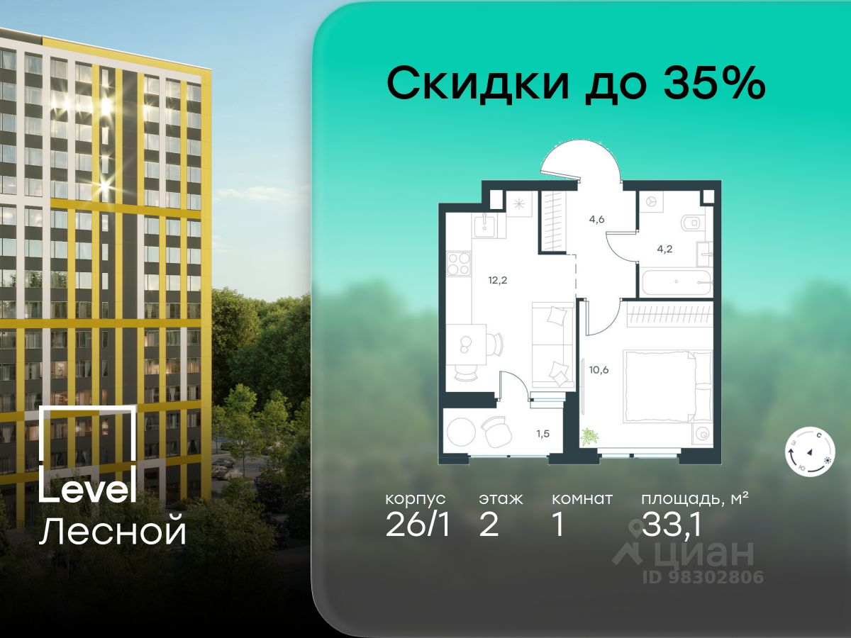 В районе, утопающем в густой зелени лесов, многочисленных парков и скверов, продаётся 1-комнатная квартира площадью 33.10 кв.м с отделкой white box. Квартира расположена на 2 этаже в жилом комплексе комфорт-класса Level Лесной (компания Level Group/Левел групп).