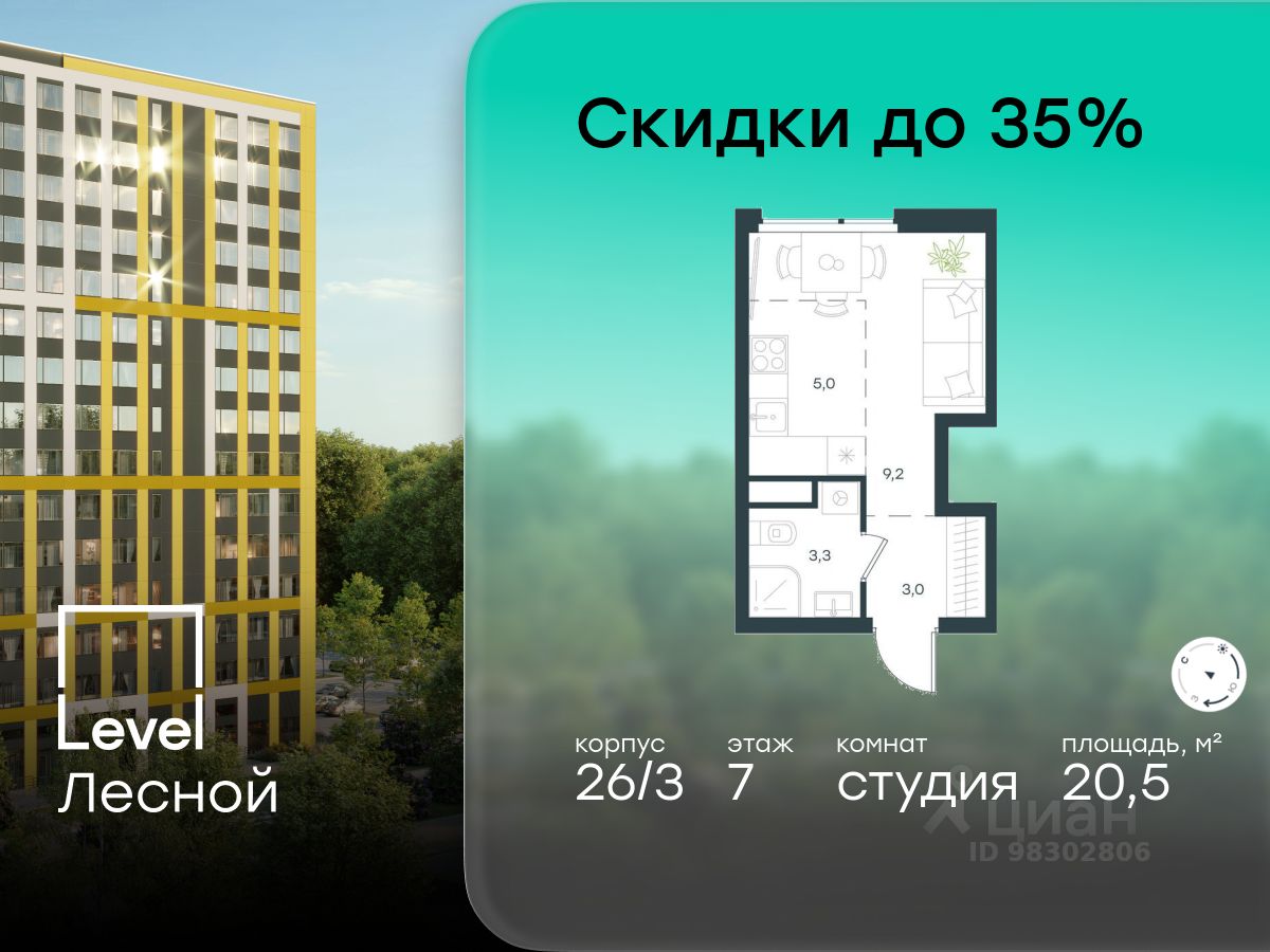 В районе, утопающем в густой зелени лесов, многочисленных парков и скверов, продаётся студия площадью 20.50 кв.м без отделки. Квартира расположена на 7 этаже в жилом комплексе комфорт-класса Level Лесной (компания Level Group/Левел групп).
