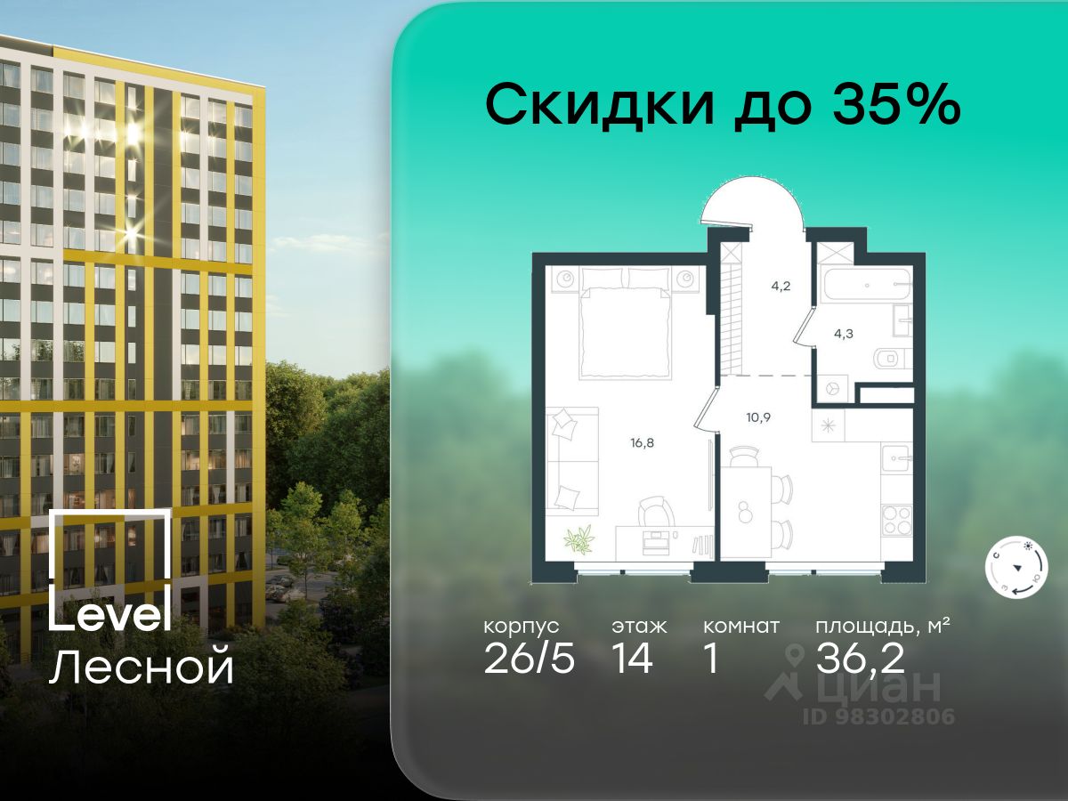 В районе, утопающем в густой зелени лесов, многочисленных парков и скверов, продаётся 1-комнатная квартира площадью 36.20 кв.м с отделкой white box. Квартира расположена на 14 этаже в жилом комплексе комфорт-класса Level Лесной (компания Level Group/Левел групп).