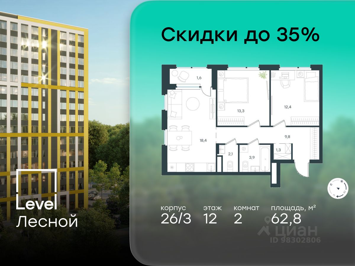 В районе, утопающем в густой зелени лесов, многочисленных парков и скверов, продаётся 2-комнатная квартира площадью 62.80 кв.м без отделки. Квартира расположена на 12 этаже в жилом комплексе комфорт-класса Level Лесной (компания Level Group/Левел групп).