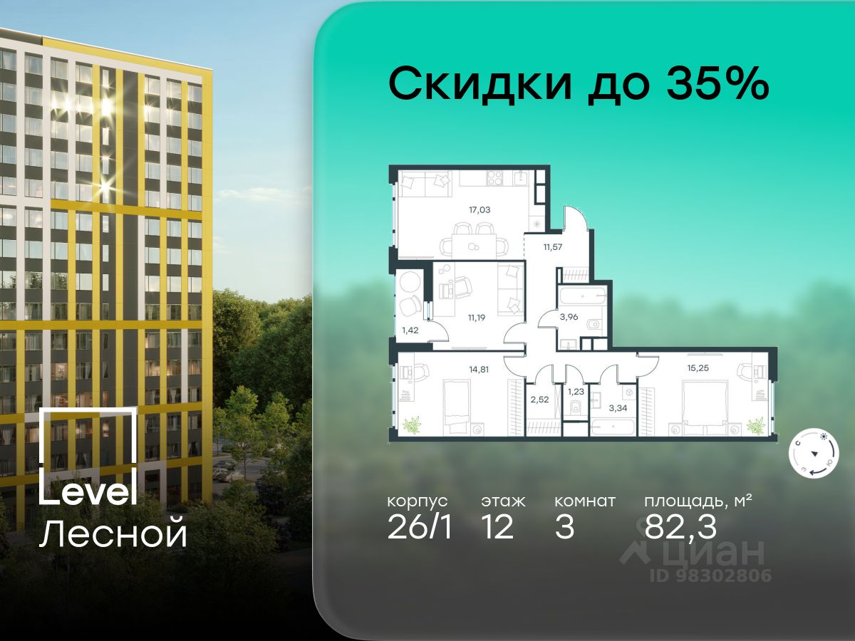 В районе, утопающем в густой зелени лесов, многочисленных парков и скверов, продаётся 3-комнатная квартира площадью 82.30 кв.м с отделкой white box. Квартира расположена на 12 этаже в жилом комплексе комфорт-класса Level Лесной (компания Level Group/Левел групп).