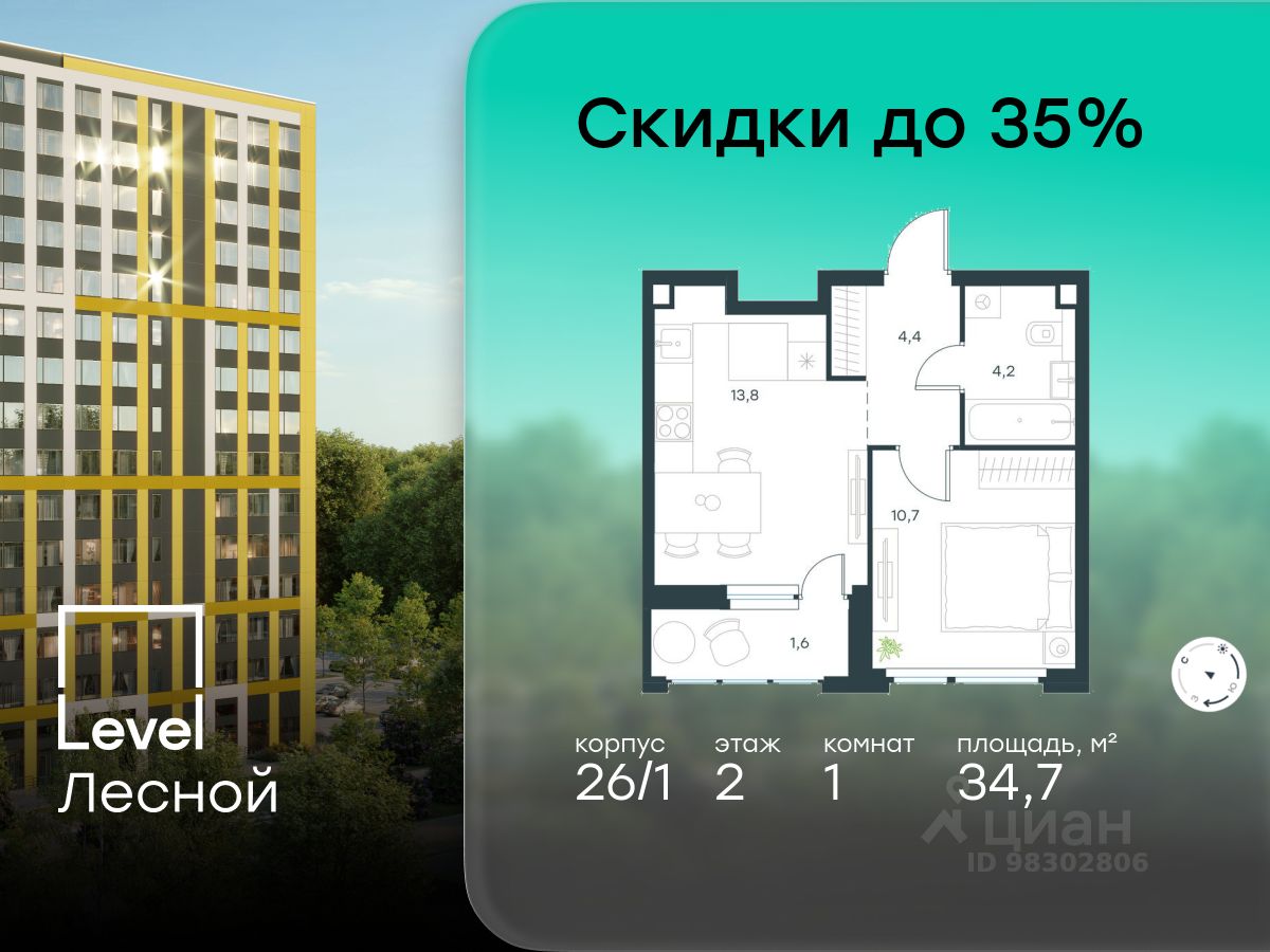 В районе, утопающем в густой зелени лесов, многочисленных парков и скверов, продаётся 1-комнатная квартира площадью 34.70 кв.м с отделкой white box. Квартира расположена на 2 этаже в жилом комплексе комфорт-класса Level Лесной (компания Level Group/Левел групп).