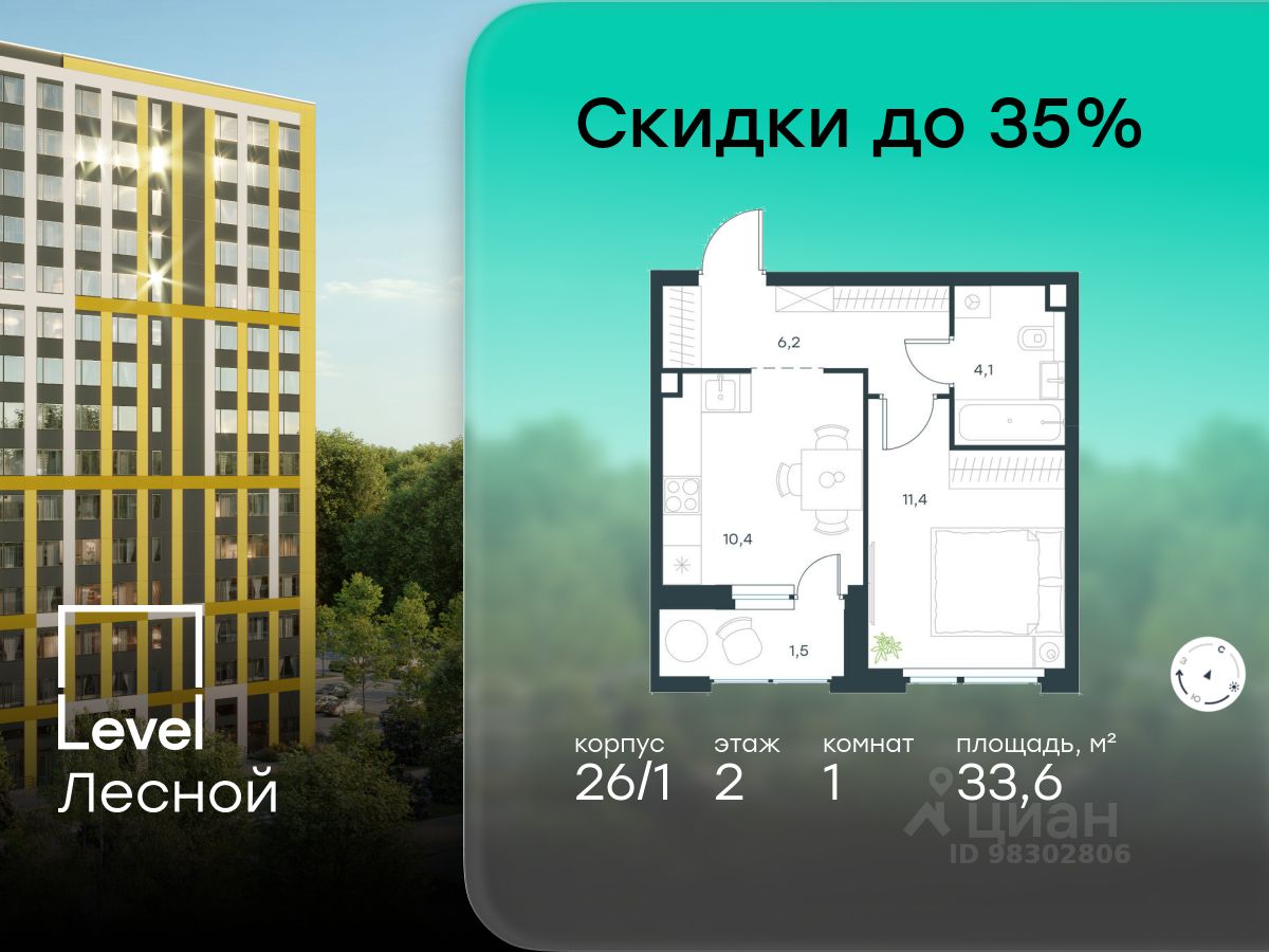 В районе, утопающем в густой зелени лесов, многочисленных парков и скверов, продаётся 1-комнатная квартира площадью 33.60 кв.м с отделкой white box. Квартира расположена на 2 этаже в жилом комплексе комфорт-класса Level Лесной (компания Level Group/Левел групп).