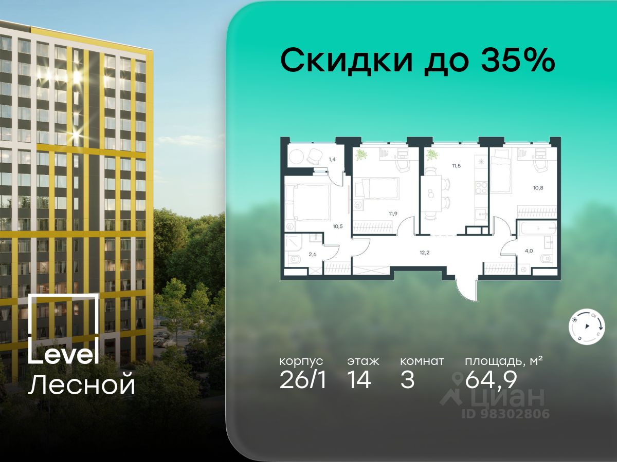 В районе, утопающем в густой зелени лесов, многочисленных парков и скверов, продаётся 3-комнатная квартира площадью 64.90 кв.м с отделкой white box. Квартира расположена на 14 этаже в жилом комплексе комфорт-класса Level Лесной (компания Level Group/Левел групп).