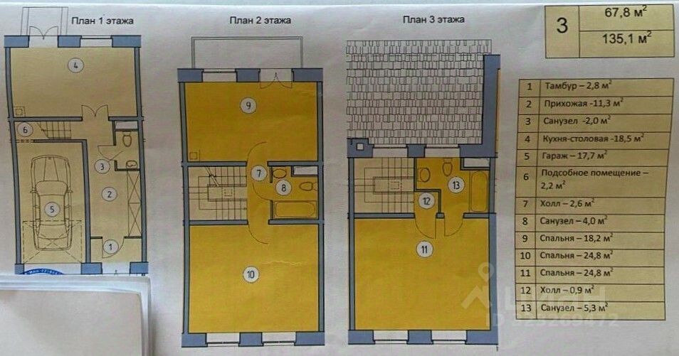 Объект 1143. Продается единственный таунхаус в ЖК ''Пятницкие кварталы'' общей площадью 135 м2 на участке земли 0,8 соток со всеми центральными коммуникациями. Таунхаус имеет 3 этажа, теплый гараж, участок земли на заднем дворе и парковку на два автомобиля перед таунхаусом.Планировка включает в себя:1 этаж: большую прихожую с нишей под встроенный шкаф, гостевой сан.узел, кухню-столовую с выходом на участок и теплый гараж, в который можно сделать вход из дома. В кухне-столовой возможно оборудовать камин, так как шахта для этого предусмотрена. Со своего участка есть прямой выход в лесную часть района для прогулок или выгула животных.2 этаж: две большие спальни с выходом из одной на балкон, а также сан.узел. В спальне, которая имеет выход на балкон также можно оборудовать естественны камин.3 этаж: мастер-спальня сов оим сан.узлом. В сан.узле есть окно с видом на участок.Высота потолков на 1 и 2 этаже 3 метра, на 3 этаже 4,9 метров, что дает возможность увеличить площадь дома, возведя на 3 этаже антресольный этаж. Теплый гараж можно использовать в качестве помещения под ведение бизнеса, что уже делают в соседних таунхаусах.Территория жилого комплекса имеет всю необходимую инфраструктуру с магазинами, салонами и прочей коммерцией. А школы и детские сады находятся в пешей доступности от дома. Остановка до метро Пятницкое шоссе находится в 5 минутах пешком от таунхауса.Обременений нет, в собственности с 2017 года, покупали по ДДУ. Звоните для записи на показ! Лот:1664.