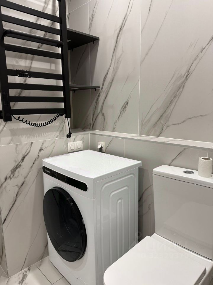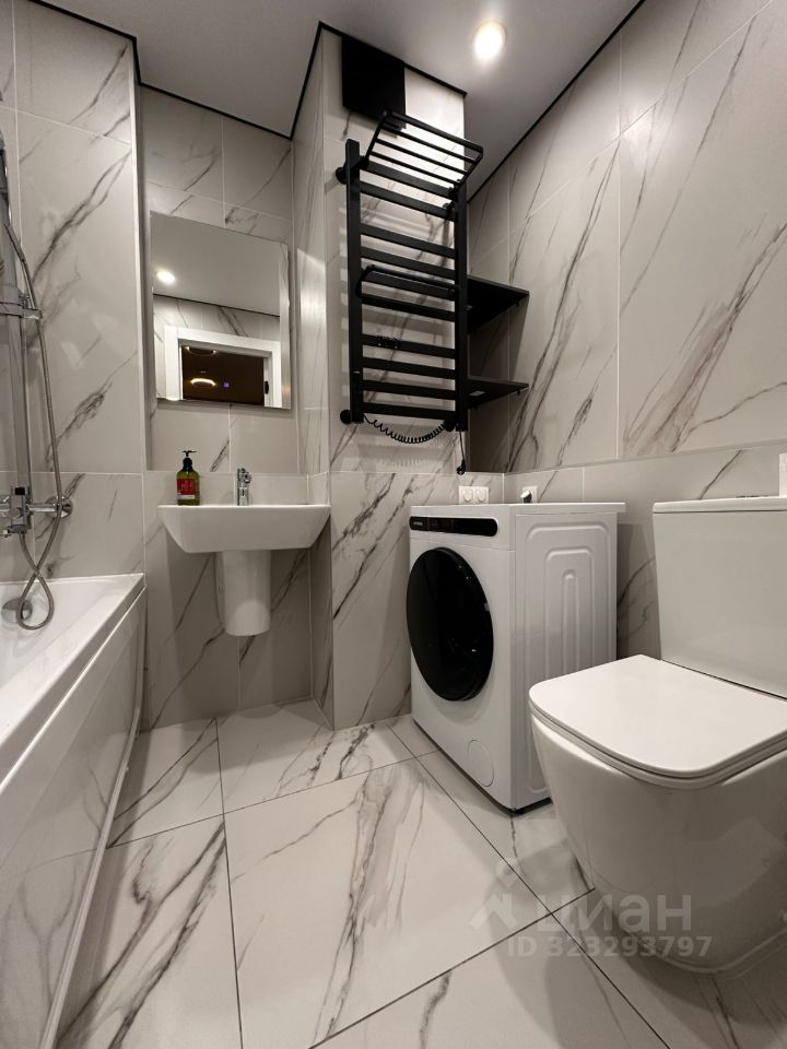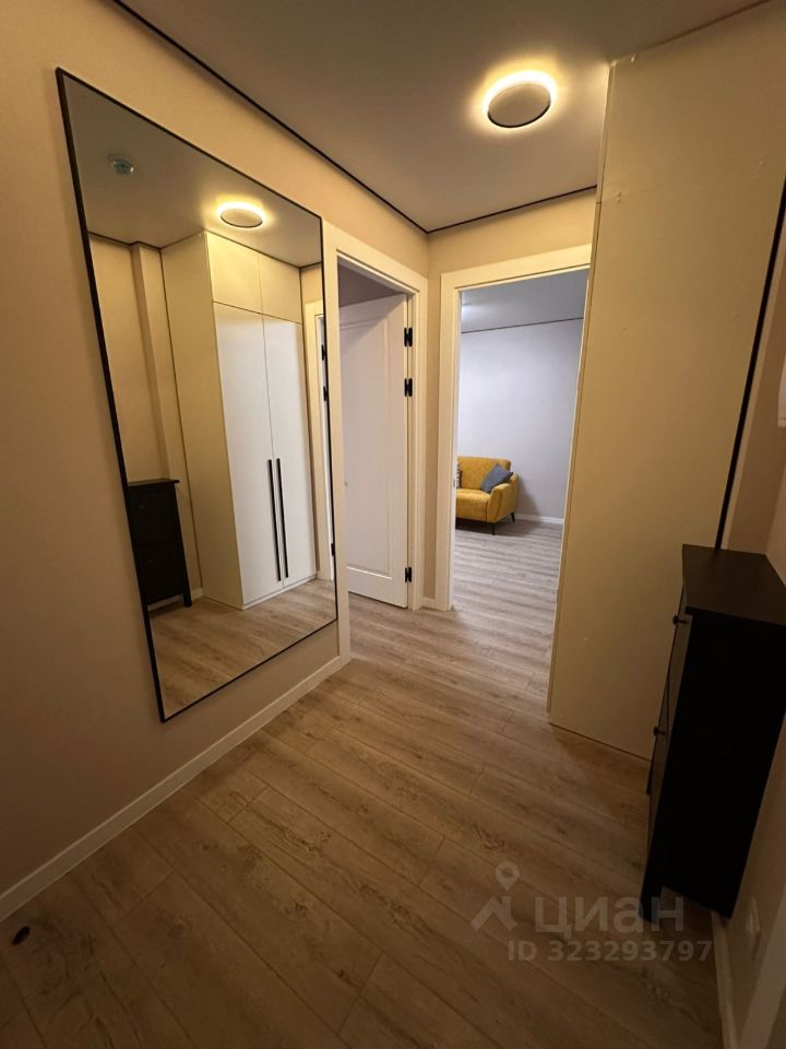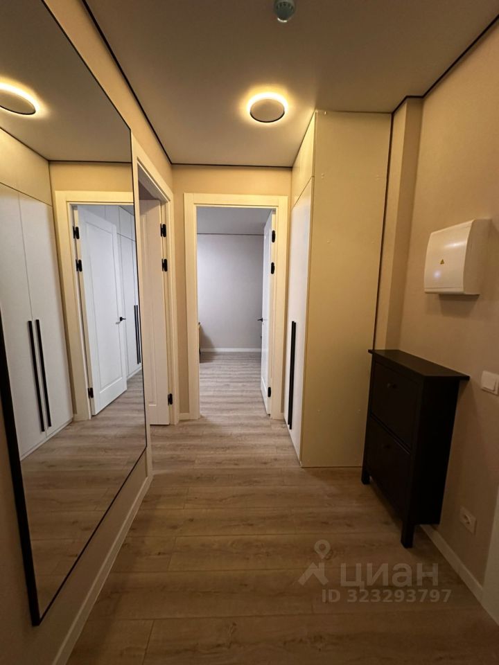 Ванная комната просторная — около четырёх квадратных метров, со стиральной машиной с сушкой. В холле — панорамное зеркало и обувница.