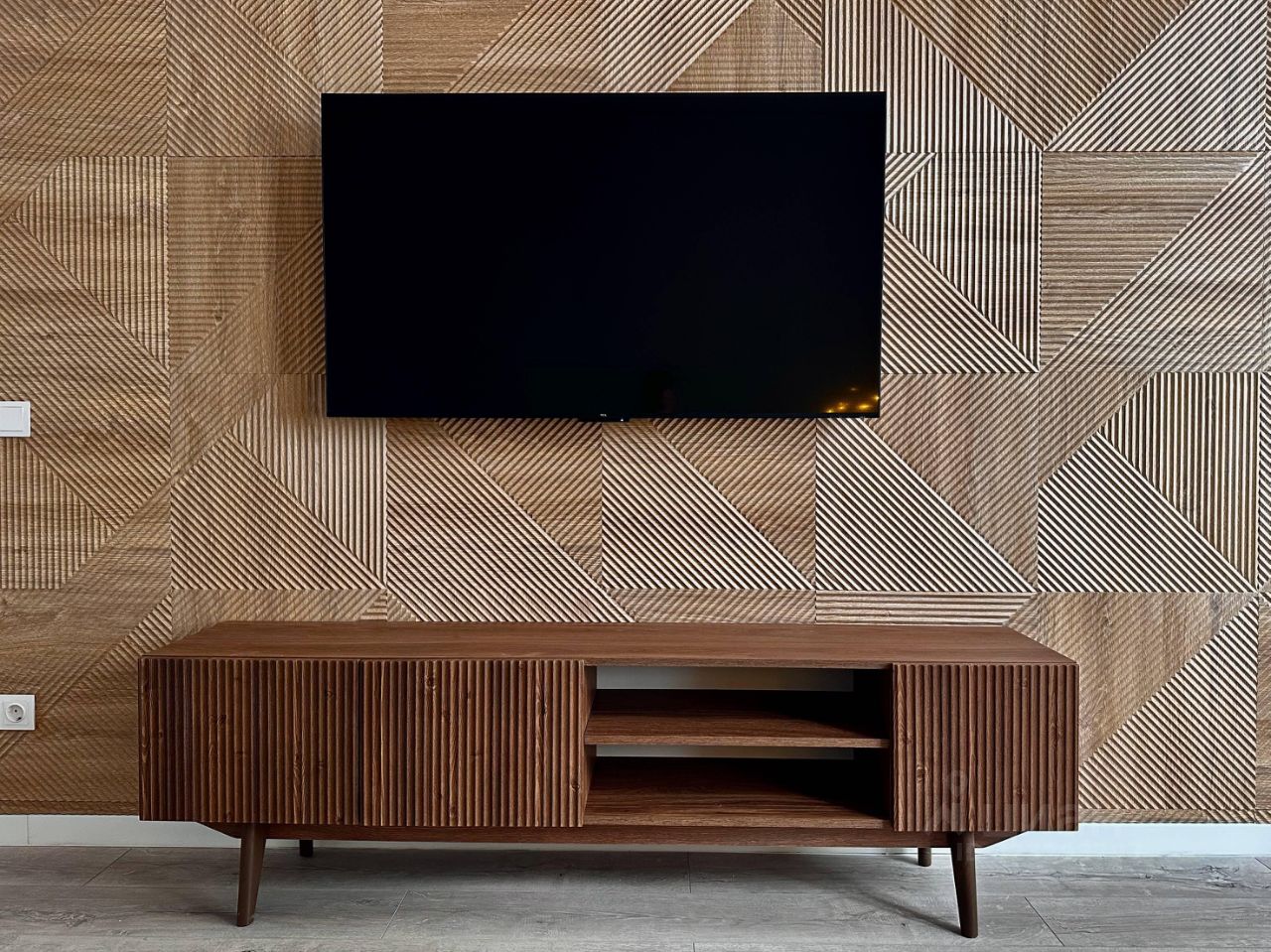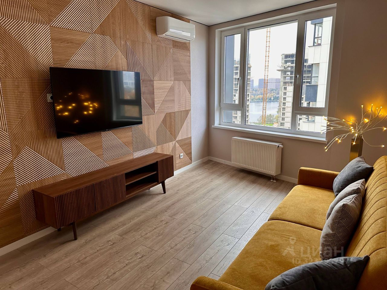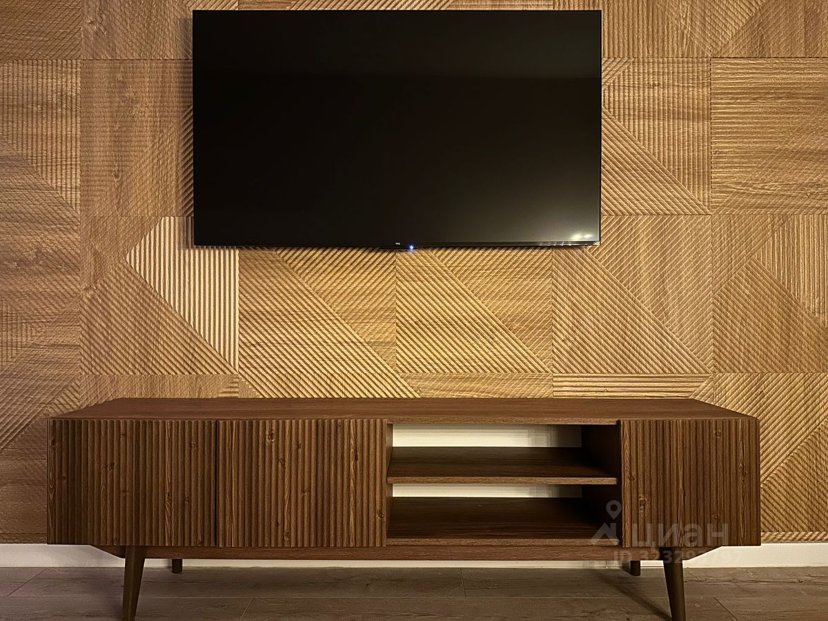 Гостиная оформлена в тёплых оттенках, стены декорированы панелями под дерево. Есть раскладывающийся диван, что позволяет при необходимости превратить комнату в полноценную спальню. Телевизор 55 дюймов с технологией nano QLED и системой Google Smart TV обеспечивает отличное качество изображения и быстрый доступ к онлайн-сервисам. Установлен кондиционер. В интерьере предусмотрено напольное кашпо Lechuza — по желанию собственник приобретёт и поставит живое растение, например пальму.