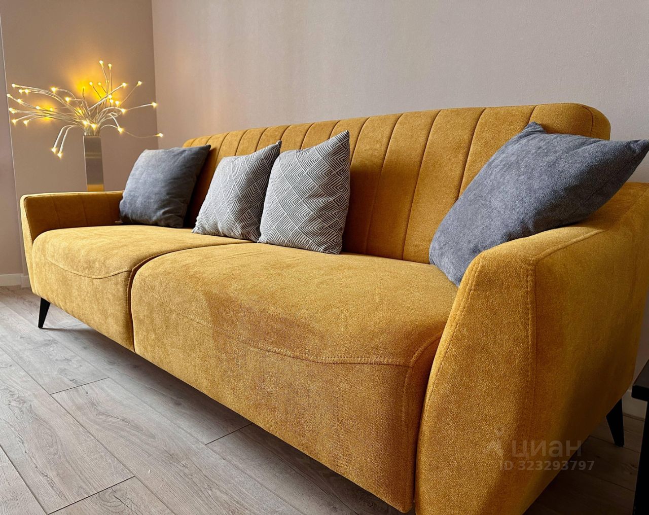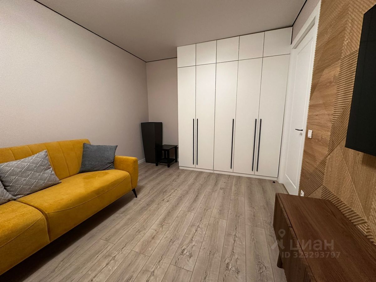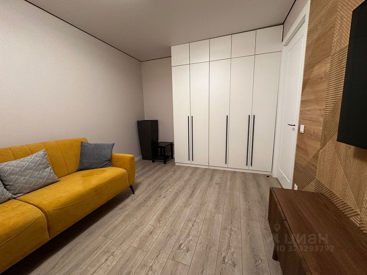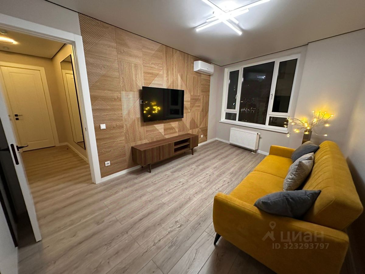 Гостиная оформлена в тёплых оттенках, стены декорированы панелями под дерево. Есть раскладывающийся диван, что позволяет при необходимости превратить комнату в полноценную спальню. Телевизор 55 дюймов с технологией nano QLED и системой Google Smart TV обеспечивает отличное качество изображения и быстрый доступ к онлайн-сервисам. Установлен кондиционер. В интерьере предусмотрено напольное кашпо Lechuza — по желанию собственник приобретёт и поставит живое растение, например пальму.