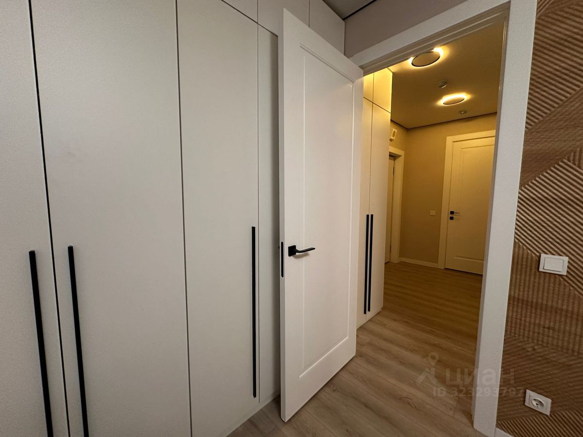 Ванная комната просторная — около четырёх квадратных метров, со стиральной машиной с сушкой. В холле — панорамное зеркало и обувница. Хранение продумано: в квартире система встроенных шкафов, чтобы всё лежало по местам и ничто не мешало.
