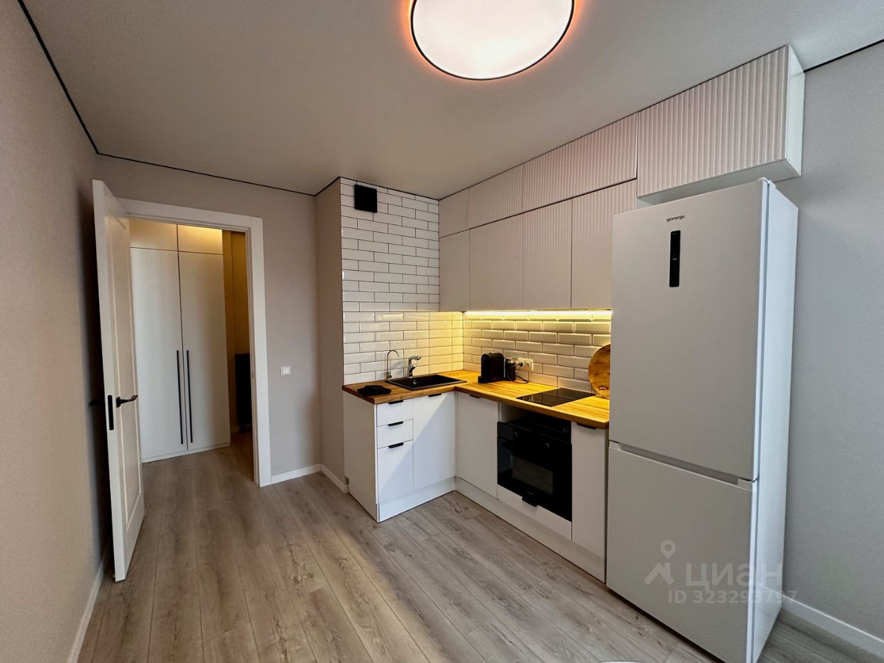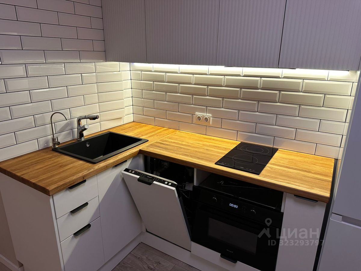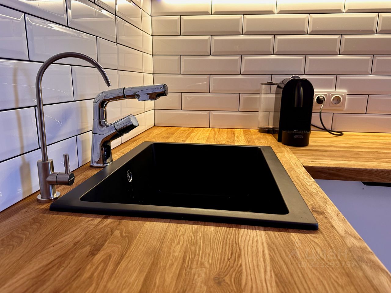 Кухня полностью оборудована: полноразмерный холодильник, посудомоечная машина, варочная поверхность, вытяжка, духовой шкаф совмещён с микроволновкой. Установлен фильтр питьевой воды с обратным осмосом. Рабочая зона облицована плиткой, столешница выполнена из массива дерева, использованы только натуральные материалы. Есть чайник с функцией поддержания температуры и кофемашина Nespresso.