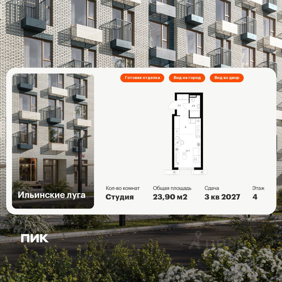Продаётся квартира-студия площадью 23,9 кв.м на 4 этаже 9 этажного дома (Корпус 3.5, Секция 2) проекта ПИК Ильинские луга. Светлый просторный подъезд на уровне земли, функциональная планировка, большие окна, c отделкой.