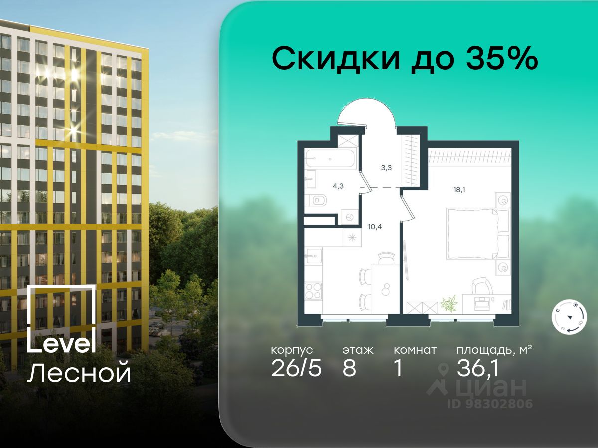 В районе, утопающем в густой зелени лесов, многочисленных парков и скверов, продаётся 1-комнатная квартира площадью 36.10 кв.м с отделкой white box. Квартира расположена на 8 этаже в жилом комплексе комфорт-класса Level Лесной (компания Level Group/Левел групп).