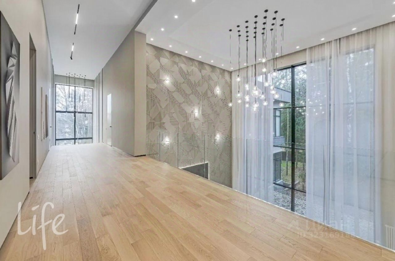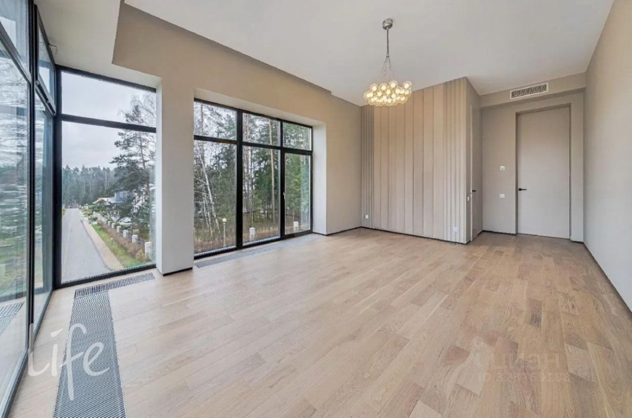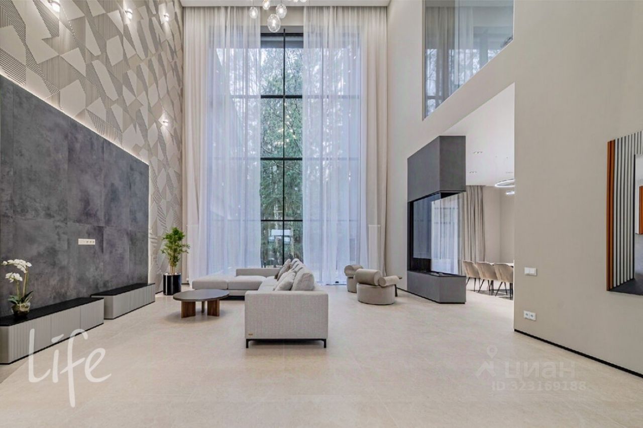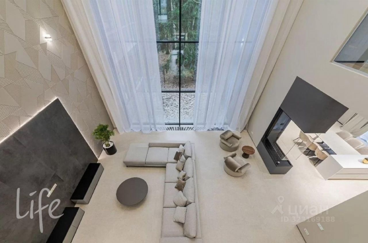 Коттеджный поселок премиум-класса ''Ренессанс парк''. Новый дом в стиле хай-тек, полностью под ключ, меблирован и оборудован всей необходимой бытовой техникой. Дизайнерский интерьер выполнен в современном стиле, в мягких, светлых тонах. Со вкусом подобрана мебель и аксессуары. Использованы современные световые решения. Гостиная с вторым светом, высота потолков около девяти метров, ее украшает двухсторонний камин.