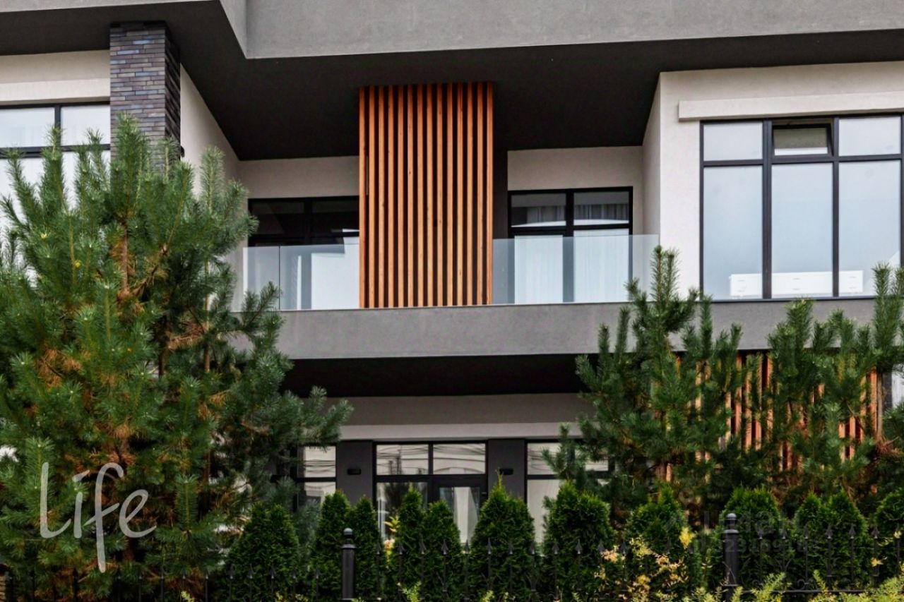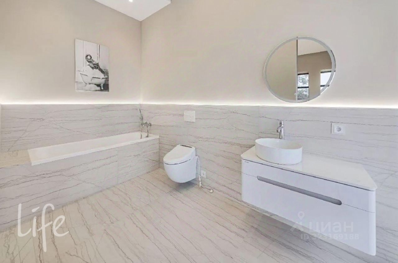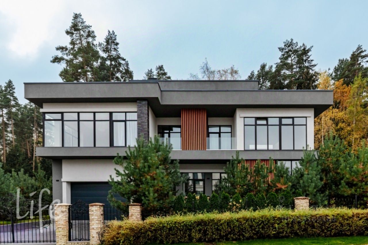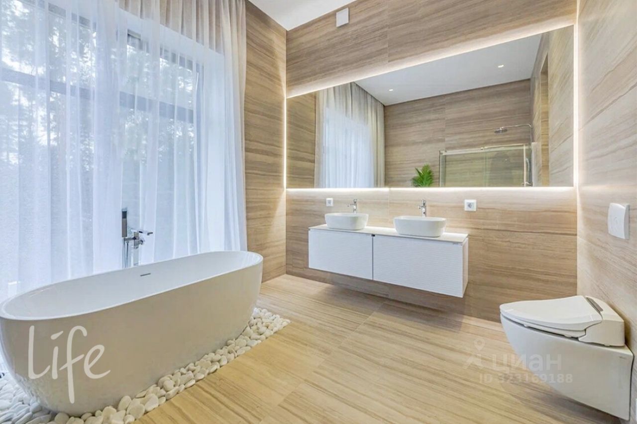 Коттеджный поселок премиум-класса ''Ренессанс парк''. Новый дом в стиле хай-тек, полностью под ключ, меблирован и оборудован всей необходимой бытовой техникой. Дизайнерский интерьер выполнен в современном стиле, в мягких, светлых тонах. Со вкусом подобрана мебель и аксессуары. Использованы современные световые решения. Гостиная с вторым светом, высота потолков около девяти метров, ее украшает двухсторонний камин.
