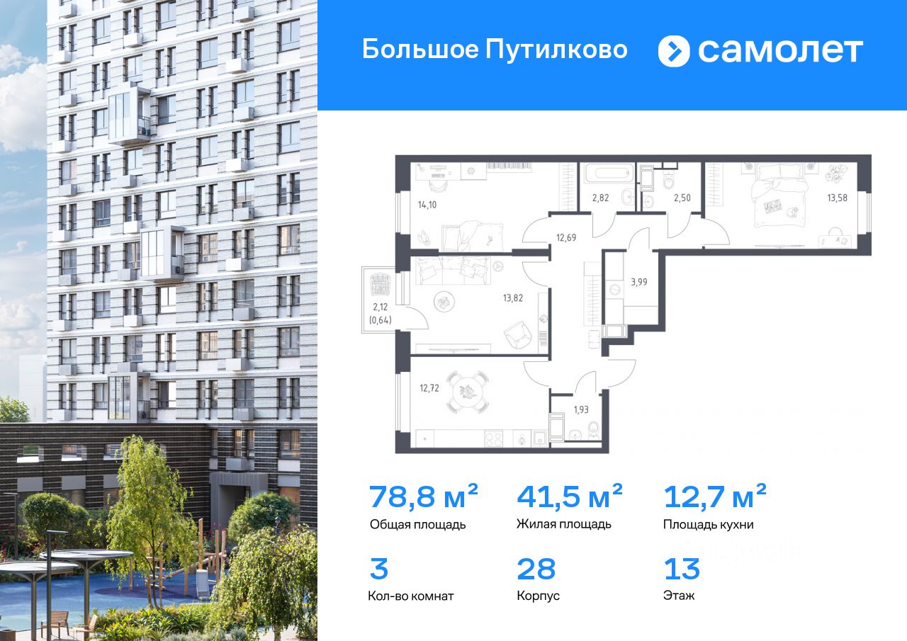 Строим кварталы для жизни с заботой о будущем. Предлагается 3-комнатная квартира комфорт-класса 78,79 кв.м в корпусе 28 на 13 этаже, в ЖК ''Большое Путилково'' Квартира с чистовой отделкой. Доступность дополнительных опций уточняйте у застройщика.