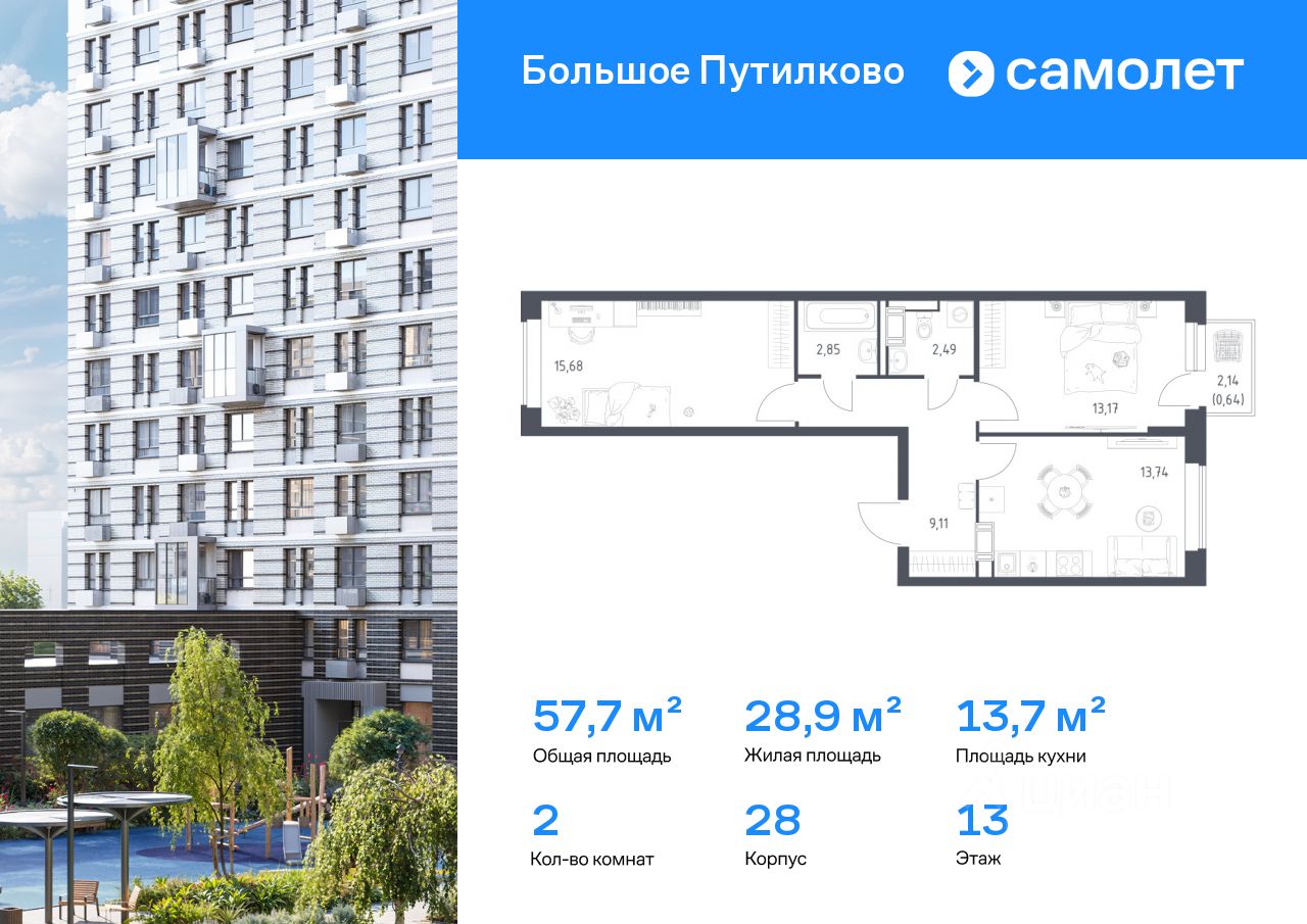Строим кварталы для жизни с заботой о будущем. Предлагается 2-комнатная квартира комфорт-класса 57,68 кв.м в корпусе 28 на 13 этаже, в ЖК ''Большое Путилково'' Квартира без отделки. Доступность опции ''отделка'' и возможность комплектации мебелью и декором уточняйте у застройщика.