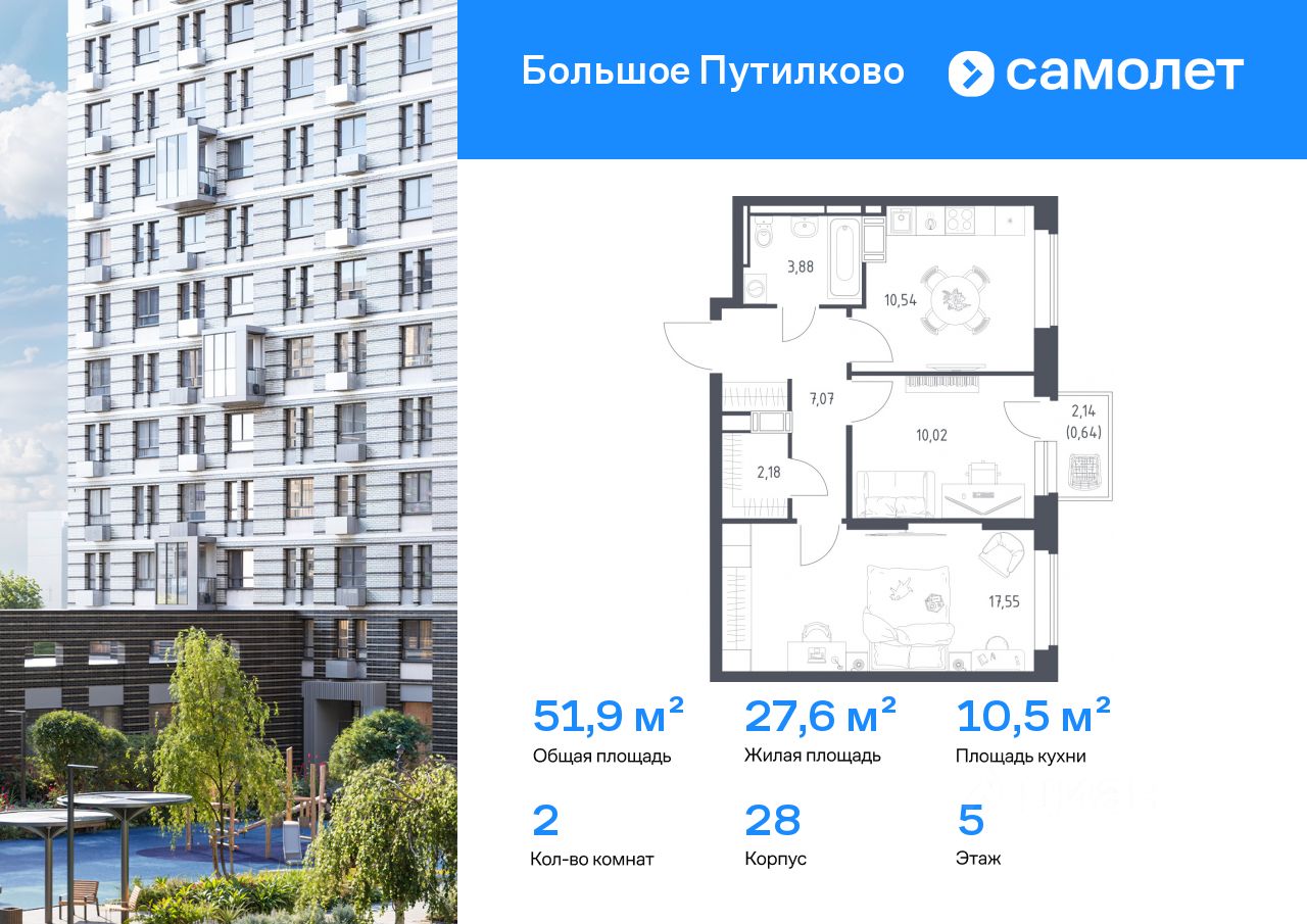 Строим кварталы для жизни с заботой о будущем. Предлагается 2-комнатная квартира комфорт-класса 51,88 кв.м в корпусе 28 на 5 этаже, в ЖК ''Большое Путилково'' Квартира без отделки. Доступность опции ''отделка'' и возможность комплектации мебелью и декором уточняйте у застройщика.