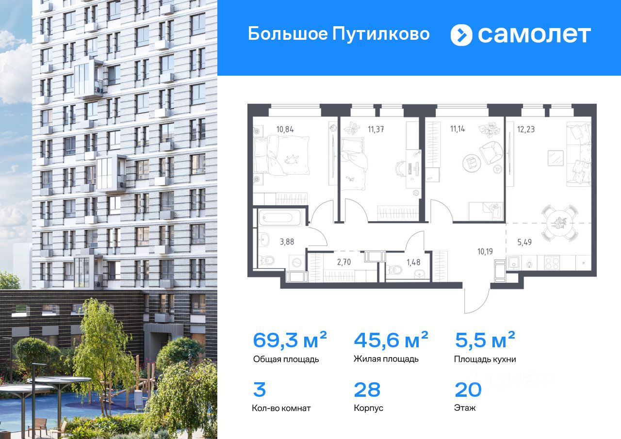 Строим кварталы для жизни с заботой о будущем. Предлагается 3-комнатная квартира комфорт-класса 69,32 кв.м в корпусе 28 на 20 этаже, в ЖК ''Большое Путилково'' Квартира с чистовой отделкой. Доступность дополнительных опций уточняйте у застройщика.