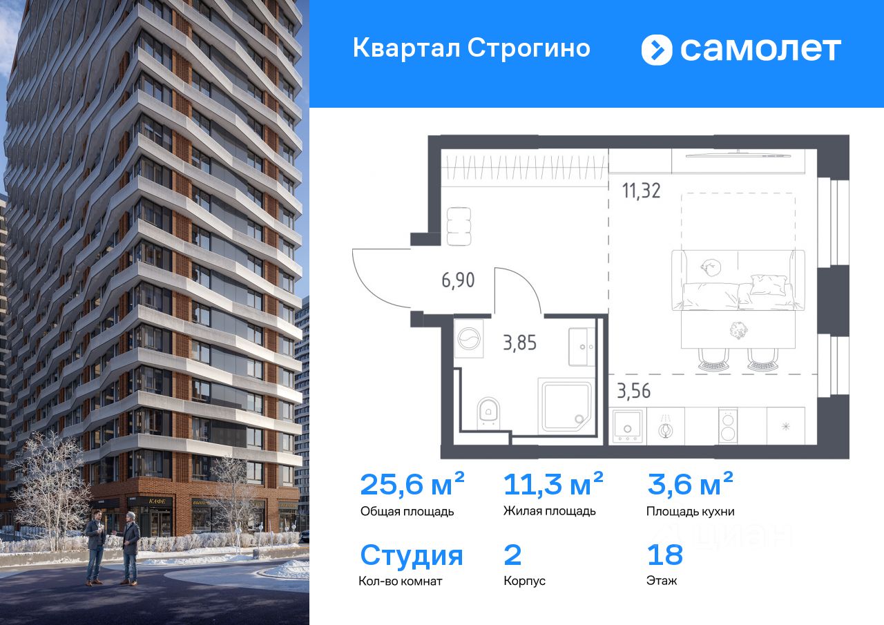 Строим кварталы для жизни с заботой о будущем. Предлагается квартира студия комфорт-класса 25,63 кв.м в корпусе 2 на 18 этаже, в ЖК ''Квартал Строгино'' Квартира с чистовой отделкой. Доступность дополнительных опций уточняйте у застройщика.