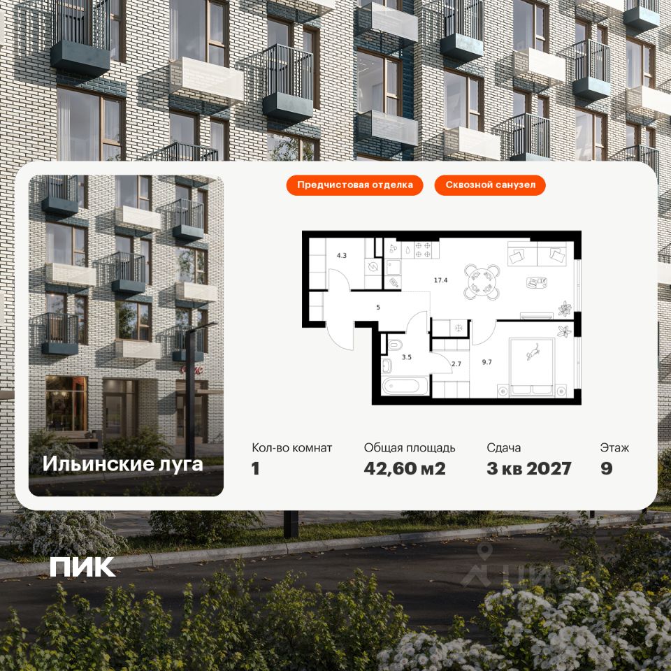 Продаётся 1-комн. квартира площадью 42,6 кв.м на 9 этаже 9 этажного дома (Корпус 4.3, Секция 4) проекта ПИК Ильинские луга. Светлый просторный подъезд на уровне земли, функциональная планировка, большие окна, предчистовая отделка.