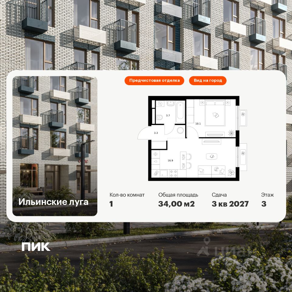 Продаётся 1-комн. квартира площадью 34 кв.м на 3 этаже 9 этажного дома (Корпус 3.1, Секция 1) проекта ПИК Ильинские луга. Светлый просторный подъезд на уровне земли, функциональная планировка, большие окна, предчистовая отделка.