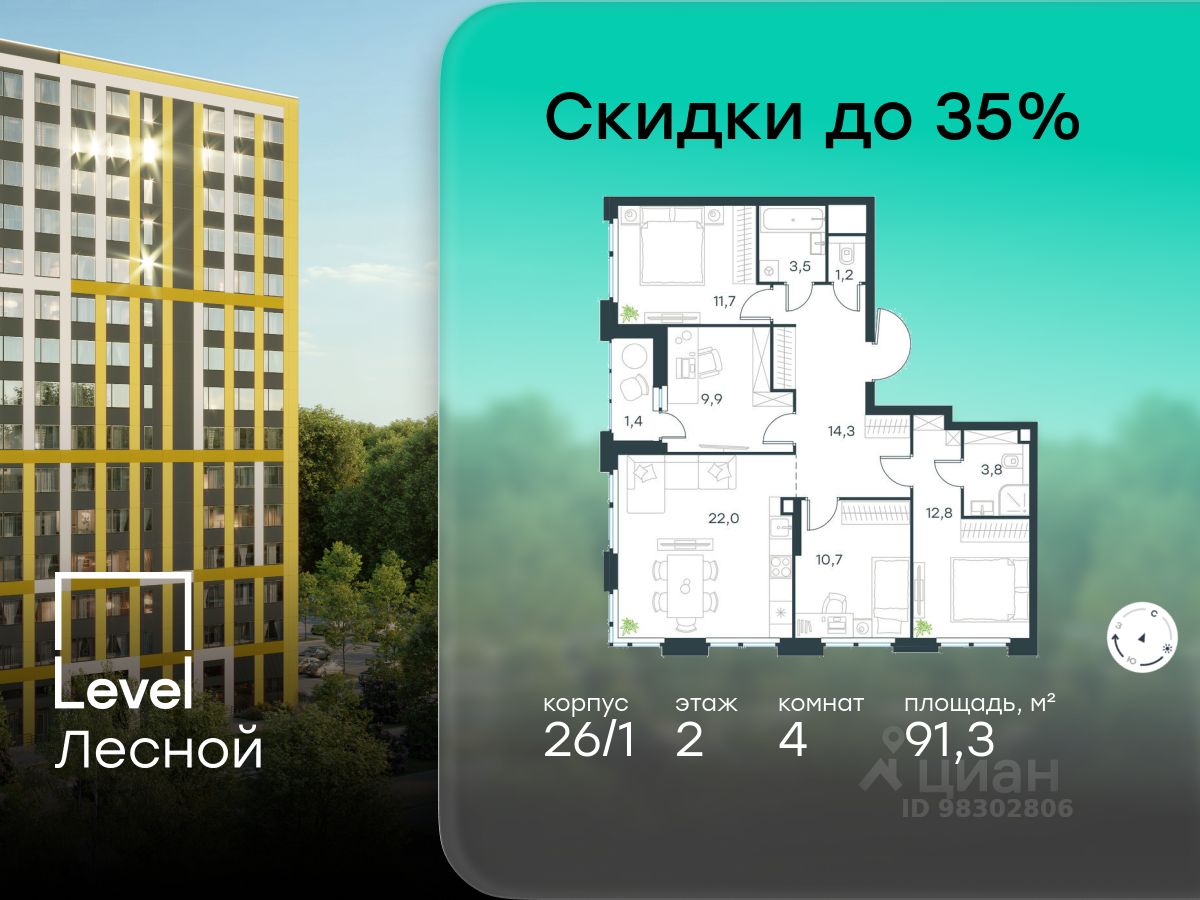 В районе, утопающем в густой зелени лесов, многочисленных парков и скверов, продаётся 4-комнатная квартира площадью 91.30 кв.м с отделкой white box. Квартира расположена на 2 этаже в жилом комплексе комфорт-класса Level Лесной (компания Level Group/Левел групп).