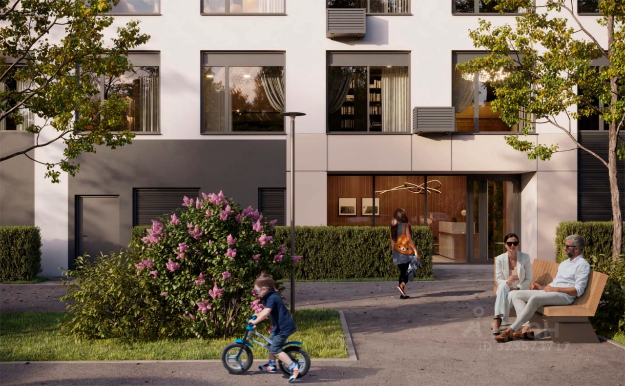 - На первых этажах размещены: зоны ресепшен и ожидания, помещения для хранения колясок и велосипедов, а также коммерческие помещения