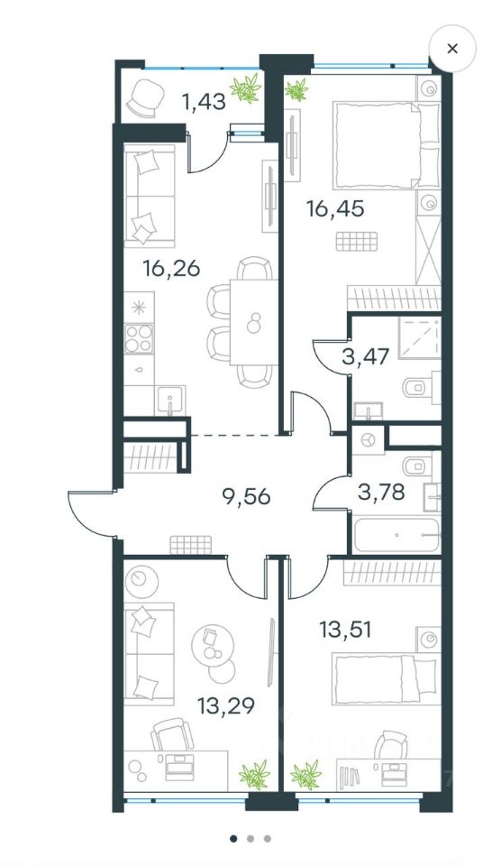 - 3 комнаты площадью 16,45, 13,29, 13,51 Квм