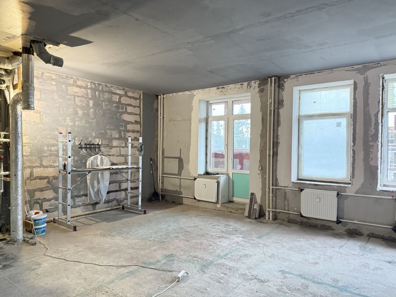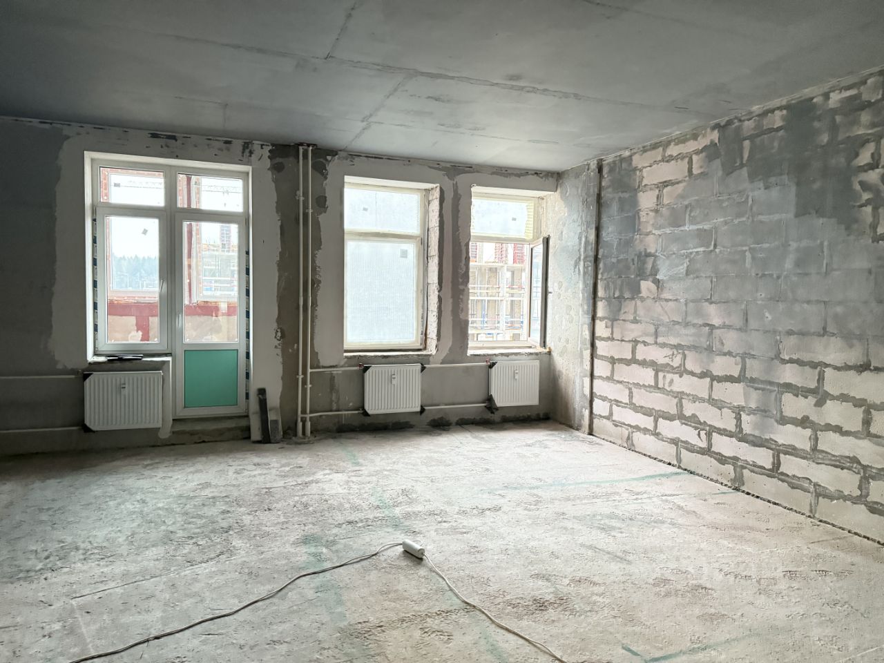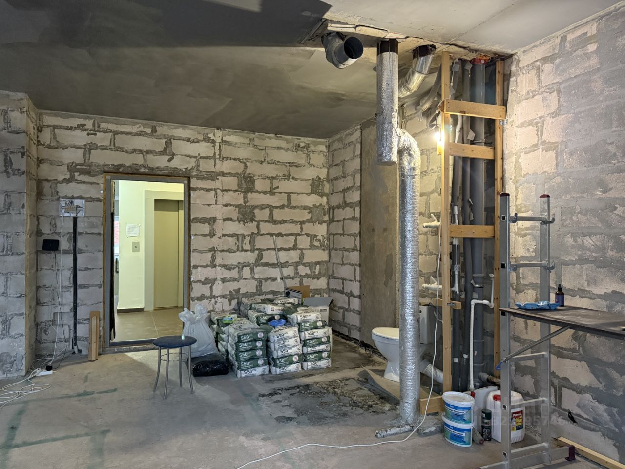 Сделана подготовка под ремонт. Снесли стены (они были кривые и сыпались), убрали некачественную стяжку, вывезли строительный мусор, все стены зачищены и прогрунтованы. Стоит хорошая, новая входная дверь. Завезли самовыравнивающийся наливной пол Litokol на всю квартиру (остается в подарок покупателю).