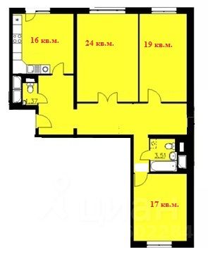 Общая 98 кв.м., кухня 16 кв.м., изолированные комнаты 24 кв.м., 17 кв.м. и 19 кв.м., два сан. узла, огромный холл.