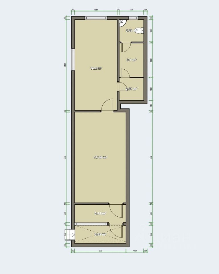 КЛЮЧЕВЫЕ ХАРАКТЕРИСТИКИ: Общая площадь: 41,2 м². Состоит из 2 основных залов (17,2 м² и 14,5 м²), 3 подсобных помещений и санузла. Высота потолков: 3.3 метра.