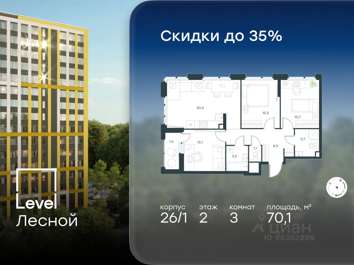 В районе, утопающем в густой зелени лесов, многочисленных парков и скверов, продаётся 3-комнатная квартира площадью 70.10 кв.м с отделкой white box. Квартира расположена на 2 этаже в жилом комплексе комфорт-класса Level Лесной (компания Level Group/Левел групп).