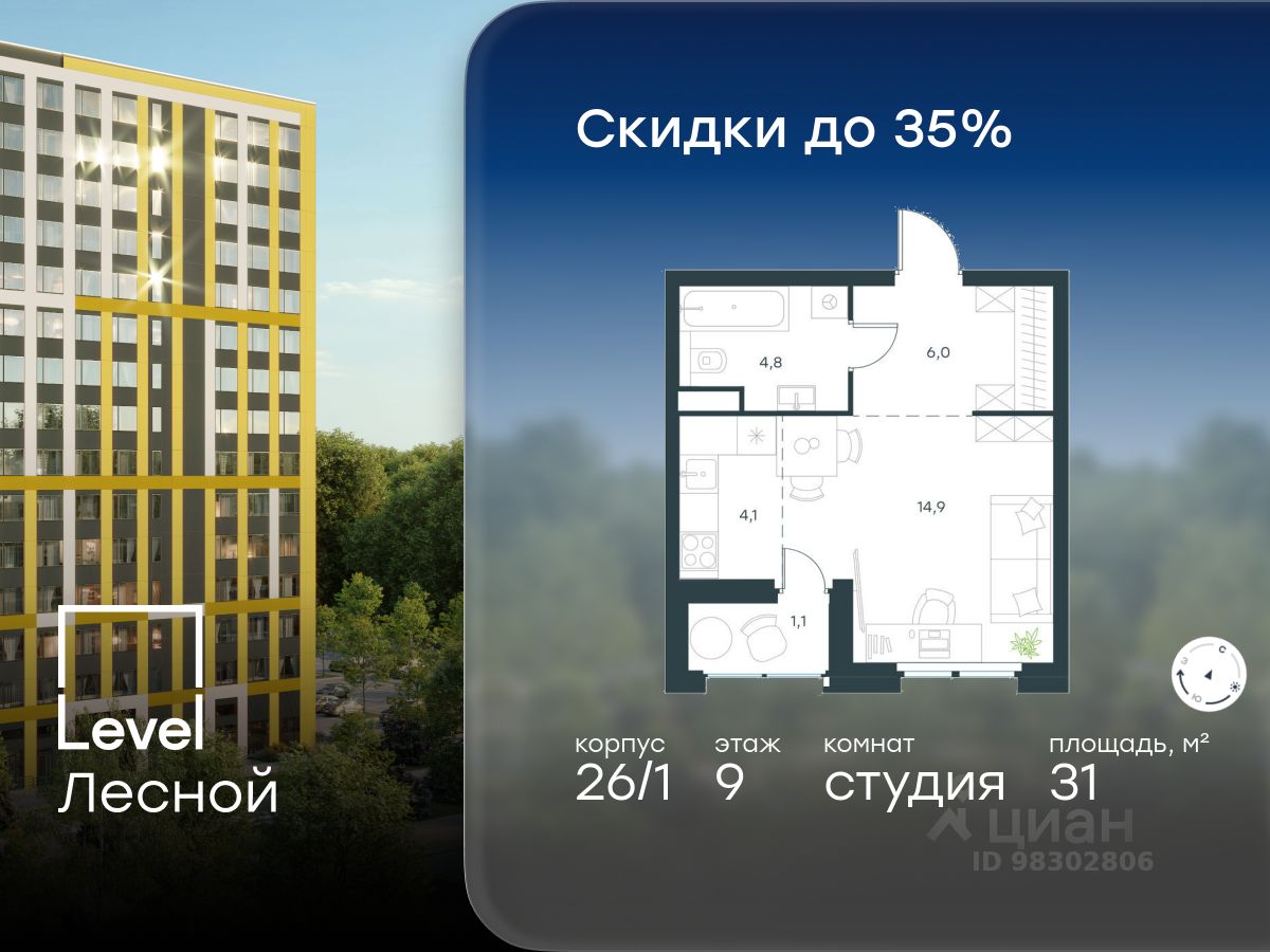 В районе, утопающем в густой зелени лесов, многочисленных парков и скверов, продаётся студия площадью 31.00 кв.м с отделкой white box. Квартира расположена на 9 этаже в жилом комплексе комфорт-класса Level Лесной (компания Level Group/Левел групп).