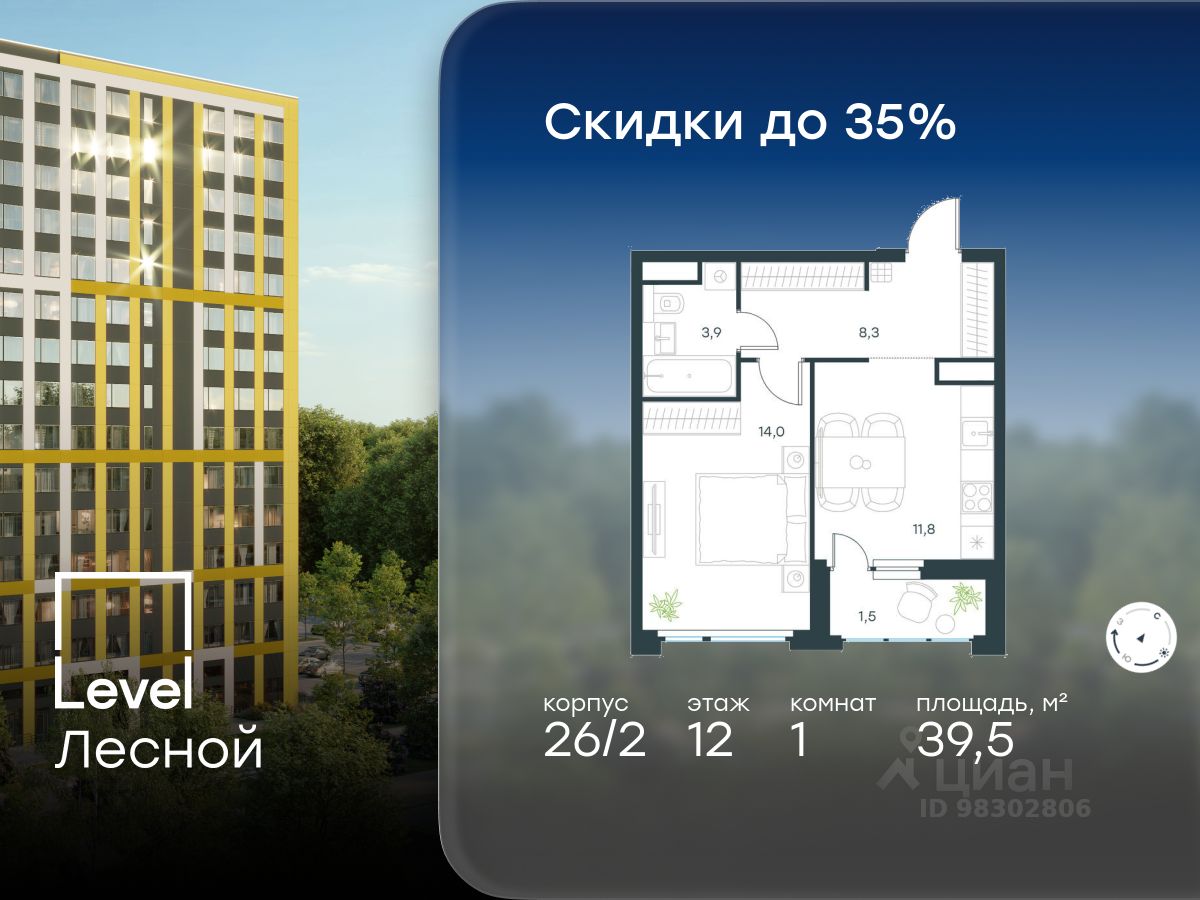 В районе, утопающем в густой зелени лесов, многочисленных парков и скверов, продаётся 1-комнатная квартира площадью 39.50 кв.м без отделки. Квартира расположена на 12 этаже в жилом комплексе комфорт-класса Level Лесной (компания Level Group/Левел групп).
