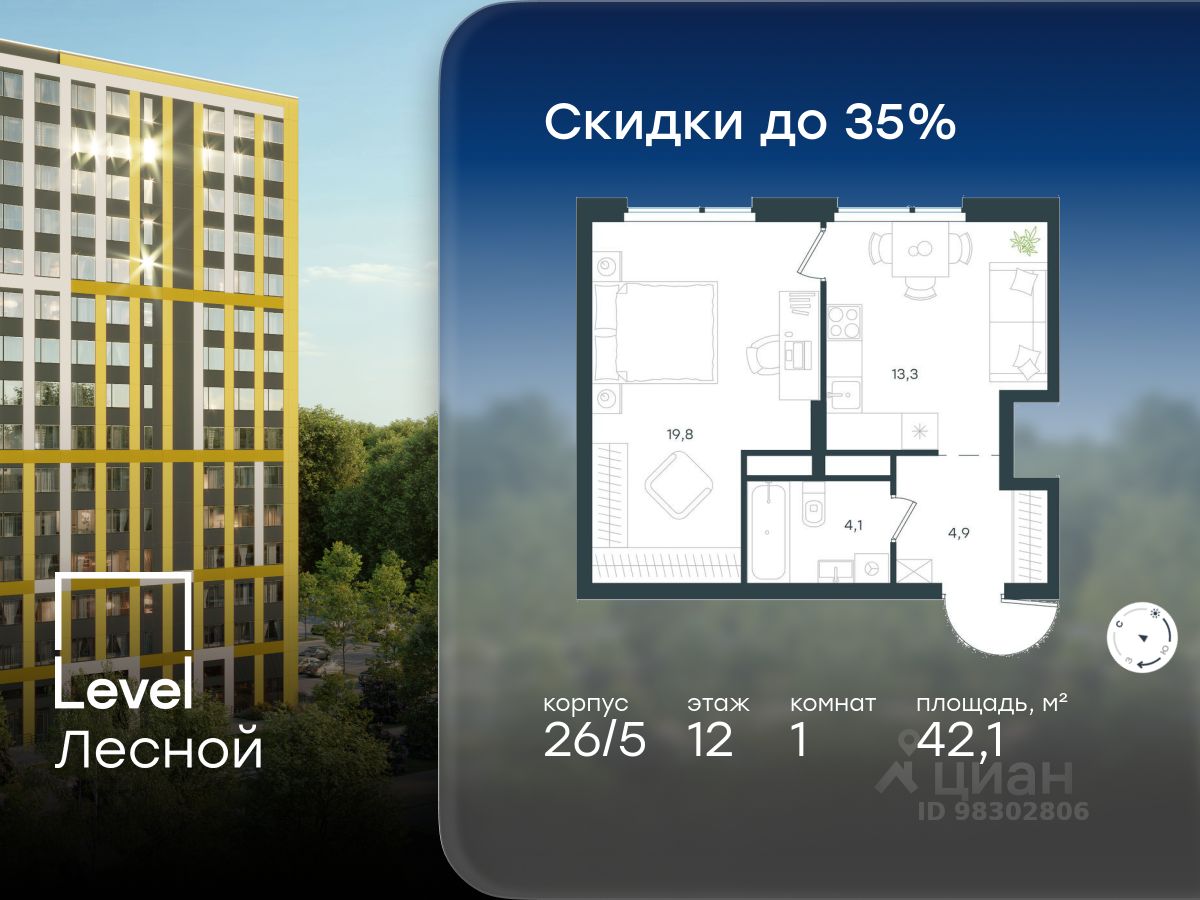 В районе, утопающем в густой зелени лесов, многочисленных парков и скверов, продаётся 1-комнатная квартира площадью 42.10 кв.м с отделкой white box. Квартира расположена на 12 этаже в жилом комплексе комфорт-класса Level Лесной (компания Level Group/Левел групп).