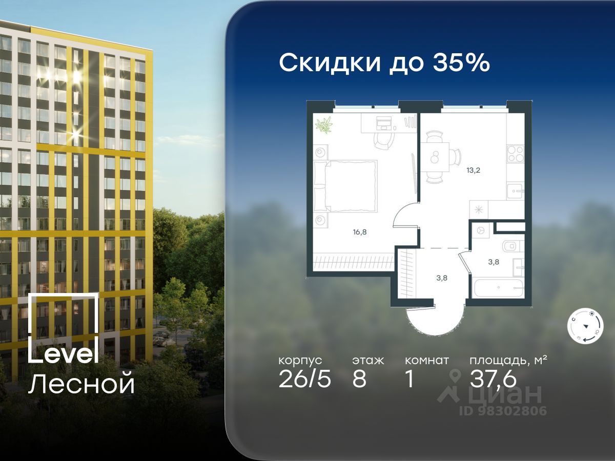 В районе, утопающем в густой зелени лесов, многочисленных парков и скверов, продаётся 1-комнатная квартира площадью 37.60 кв.м с отделкой white box. Квартира расположена на 8 этаже в жилом комплексе комфорт-класса Level Лесной (компания Level Group/Левел групп).