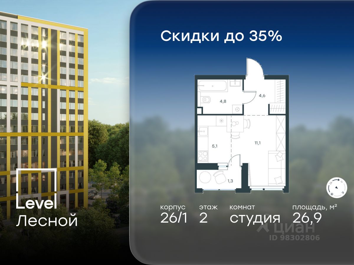В районе, утопающем в густой зелени лесов, многочисленных парков и скверов, продаётся студия площадью 26.90 кв.м с отделкой white box. Квартира расположена на 2 этаже в жилом комплексе комфорт-класса Level Лесной (компания Level Group/Левел групп).