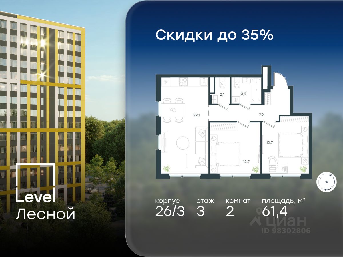 В районе, утопающем в густой зелени лесов, многочисленных парков и скверов, продаётся 2-комнатная квартира площадью 61.40 кв.м без отделки. Квартира расположена на 3 этаже в жилом комплексе комфорт-класса Level Лесной (компания Level Group/Левел групп).