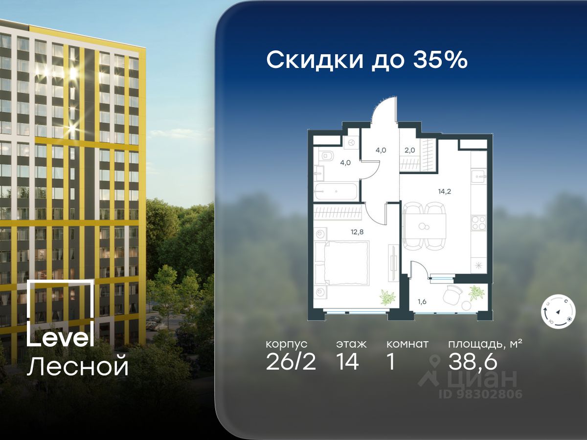 В районе, утопающем в густой зелени лесов, многочисленных парков и скверов, продаётся 1-комнатная квартира площадью 38.60 кв.м без отделки. Квартира расположена на 14 этаже в жилом комплексе комфорт-класса Level Лесной (компания Level Group/Левел групп).