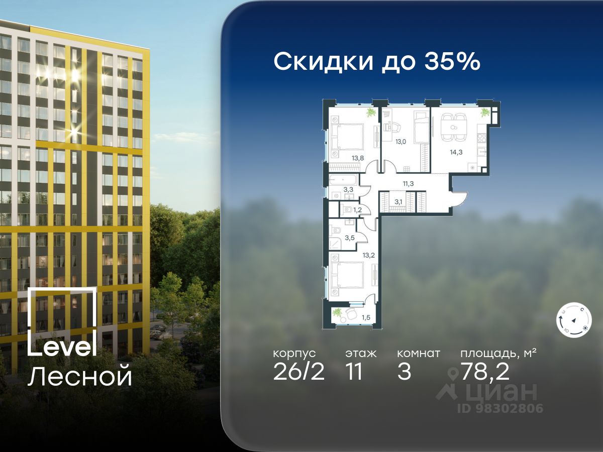 В районе, утопающем в густой зелени лесов, многочисленных парков и скверов, продаётся 3-комнатная квартира площадью 78.20 кв.м без отделки. Квартира расположена на 11 этаже в жилом комплексе комфорт-класса Level Лесной (компания Level Group/Левел групп).