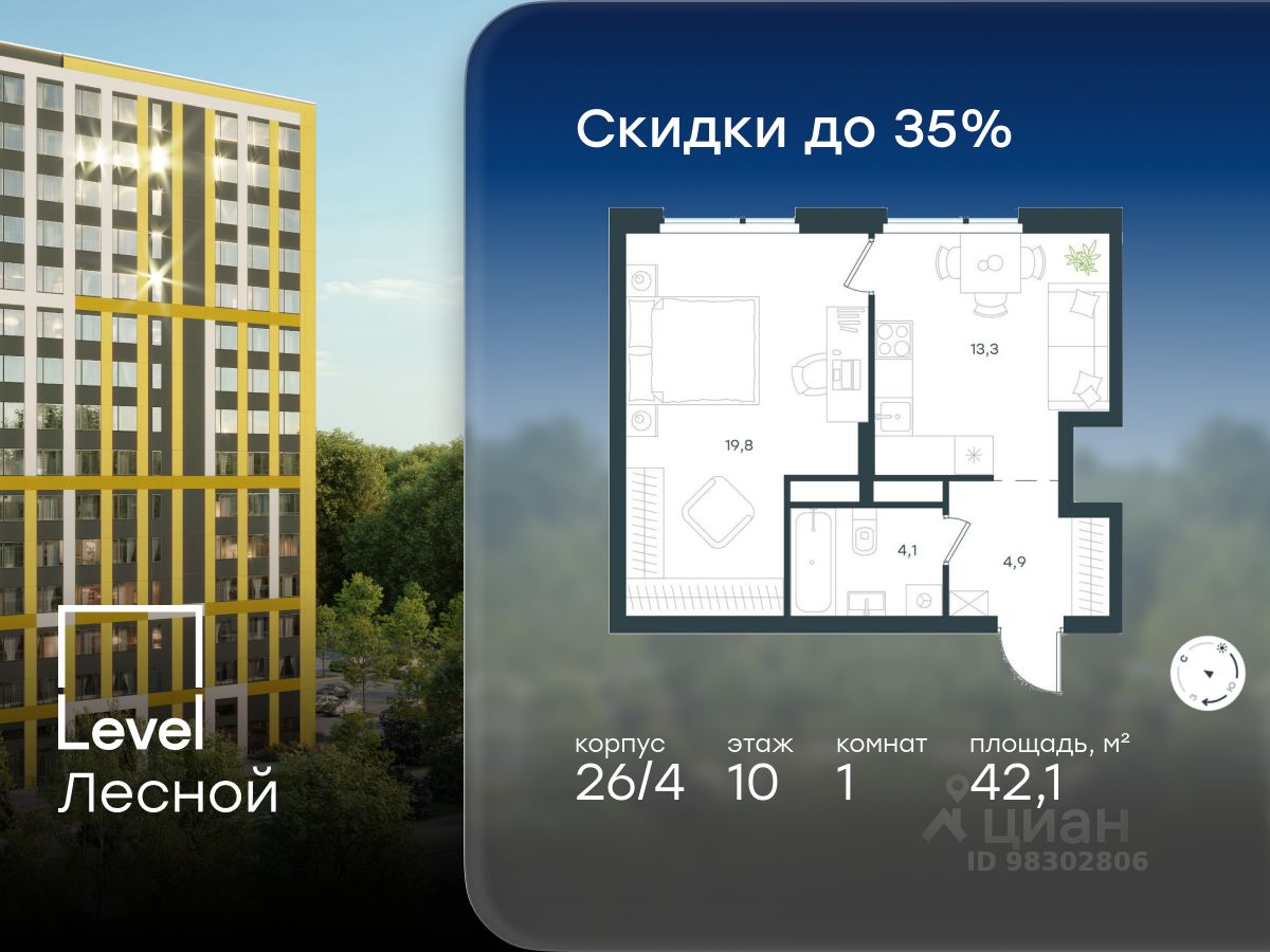 В районе, утопающем в густой зелени лесов, многочисленных парков и скверов, продаётся 1-комнатная квартира площадью 42.10 кв.м с отделкой white box. Квартира расположена на 10 этаже в жилом комплексе комфорт-класса Level Лесной (компания Level Group/Левел групп).
