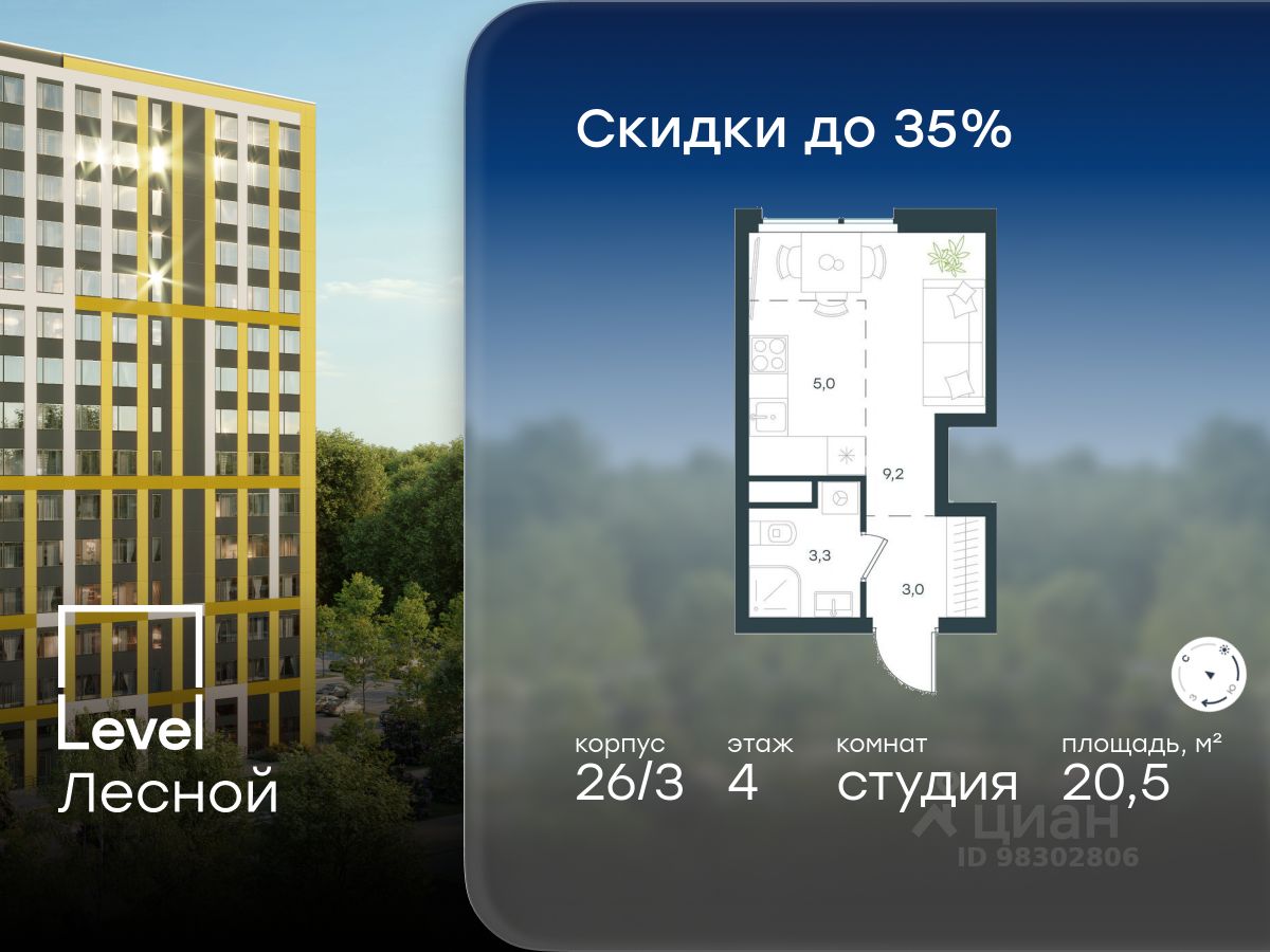 В районе, утопающем в густой зелени лесов, многочисленных парков и скверов, продаётся студия площадью 20.50 кв.м без отделки. Квартира расположена на 4 этаже в жилом комплексе комфорт-класса Level Лесной (компания Level Group/Левел групп).