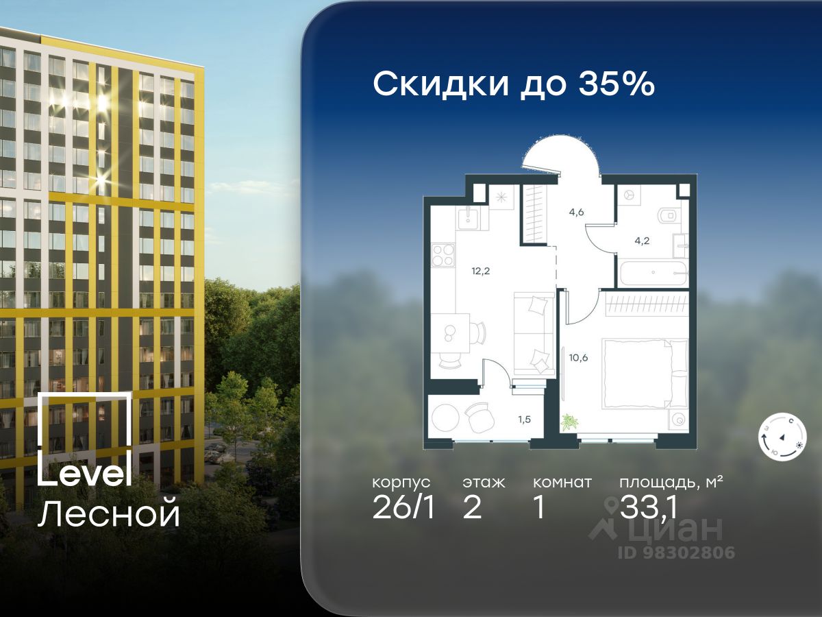 В районе, утопающем в густой зелени лесов, многочисленных парков и скверов, продаётся 1-комнатная квартира площадью 33.10 кв.м с отделкой white box. Квартира расположена на 2 этаже в жилом комплексе комфорт-класса Level Лесной (компания Level Group/Левел групп).