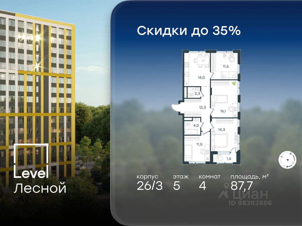 В районе, утопающем в густой зелени лесов, многочисленных парков и скверов, продаётся 4-комнатная квартира площадью 87.70 кв.м без отделки. Квартира расположена на 5 этаже в жилом комплексе комфорт-класса Level Лесной (компания Level Group/Левел групп).